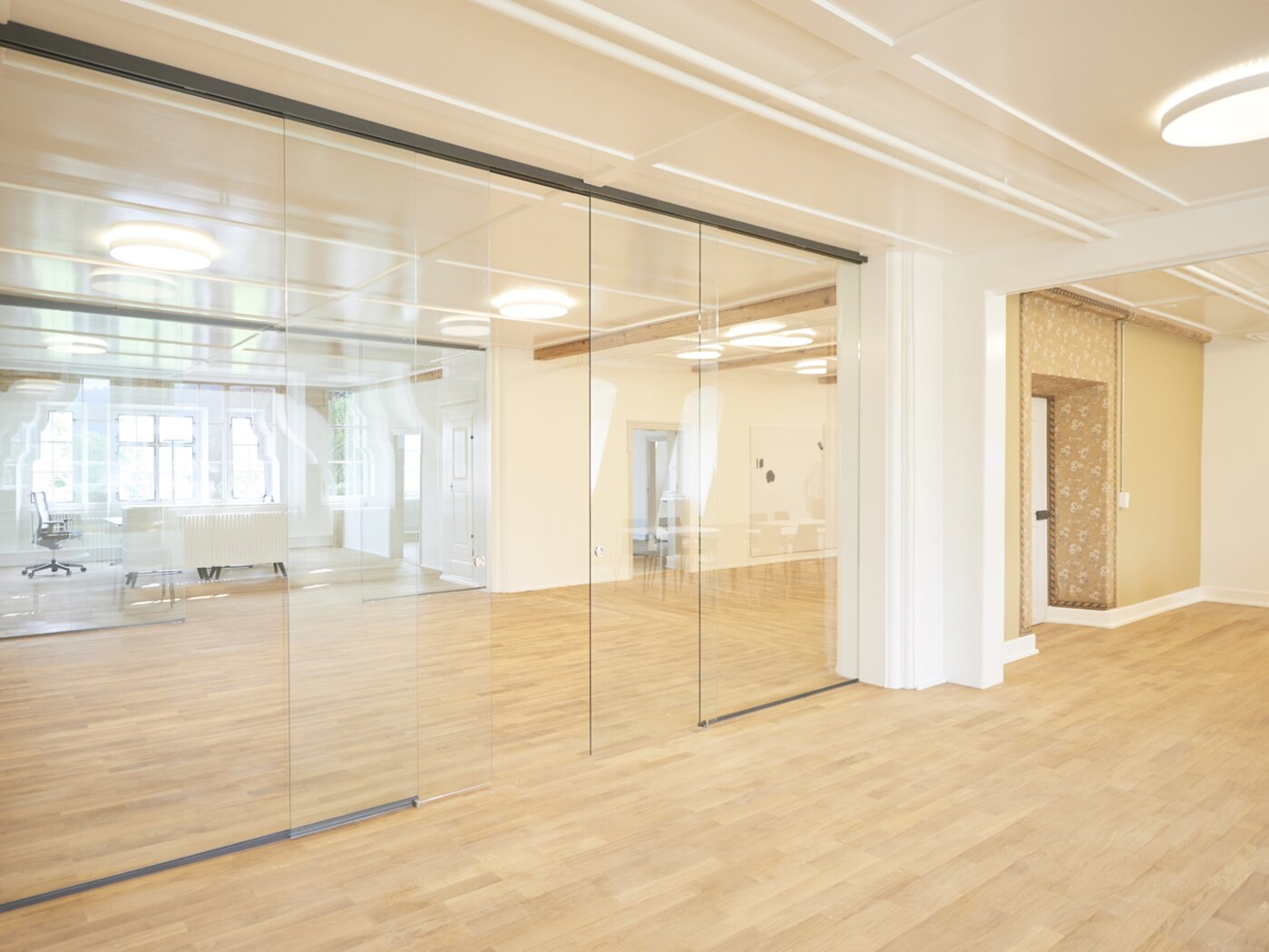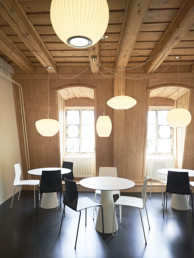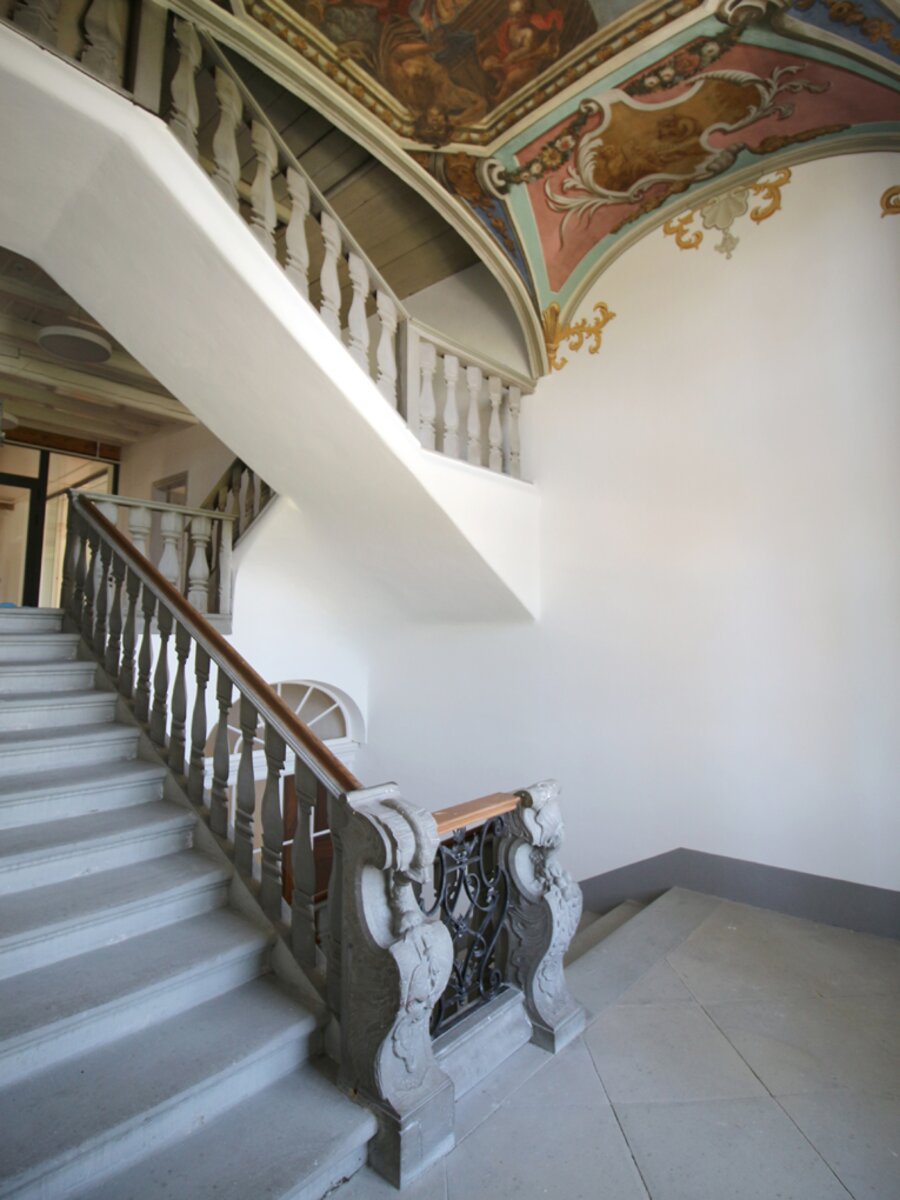 Der Umbau erfolgte nach denkmalpflegerischen Grundsätzen. Wo immer möglich wurde die wertvolle Bausubstanz erhalten und neu zur Geltung gebracht. Insbesondere die Lingustra-Prägetapeten wurden aufwendig restauriert und wieder Instand gestellt. Neben neuen Elektroinstallationen unter Putz wurde die Liftanlage bis ins 3. Obergeschoss erweitert.
