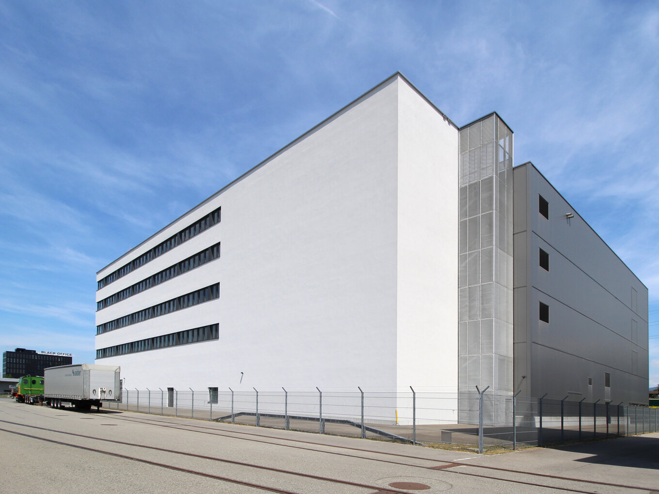 Äusserlich wie innerlich folgt Form und Materialisierung der Funktion. Eine verputzte Aussenwärmedämmung verkleidet die Fassade des Bürobaus, einfache Sandwichpanels umhüllen den Cachebau. Speziell sind die vier aussenliegenden, mit Streckmetall verkleideten Treppentürme. Sie dienen in erster Linie zur Sicherstellung der Fluchtwege. Speziell sind auch die technischen Dachaufbauten, diese verstärken den Gebäudeausdruck einer grossen Maschine.