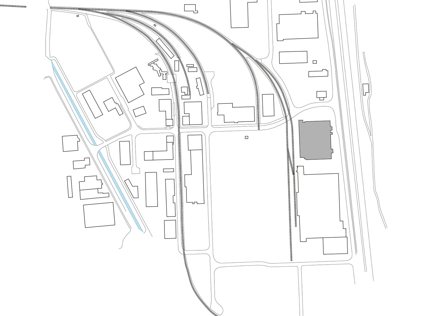Ein funktionales, in zwei Volumen gegliedertes Gebäude bestehend aus einem 5-geschossigen Bürobau und einem rückwertig angegliederten 4-geschossigen Volumen mit über 7000m2 Fläche Platz für die Datenserver. Platziert ist das Gebäude in der Mitte der Parzelle, damit die Rundumfahrt gewährleistet ist. Die Zufahrt auf die Parkplätze und das Betriebsareal erfolgt nordseitig ab der Industriestrasse.