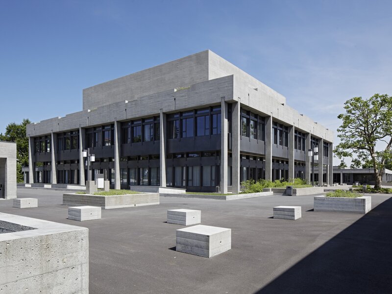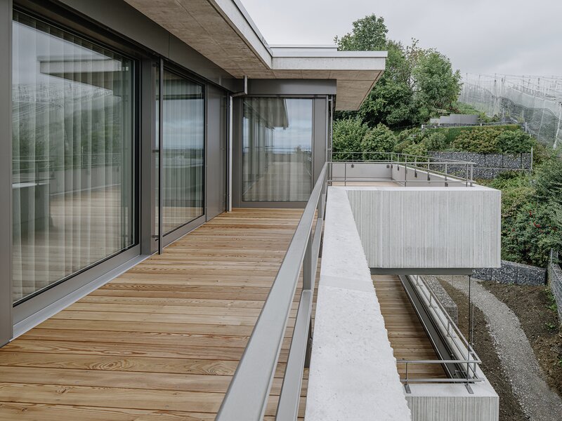 Eingebettet in die Landschaft, ohne die Silhouette der Bergkette zu verändern, befindet sich der Neubau. Sockel- und Erdgeschoss übernehmen das Spiel von geschichteten Höhenlinien und orientieren sich hauptsächlich gegen das Rheintal.