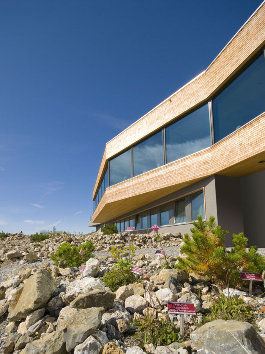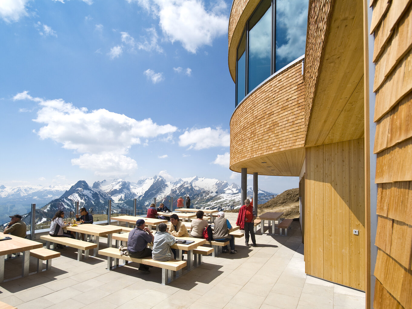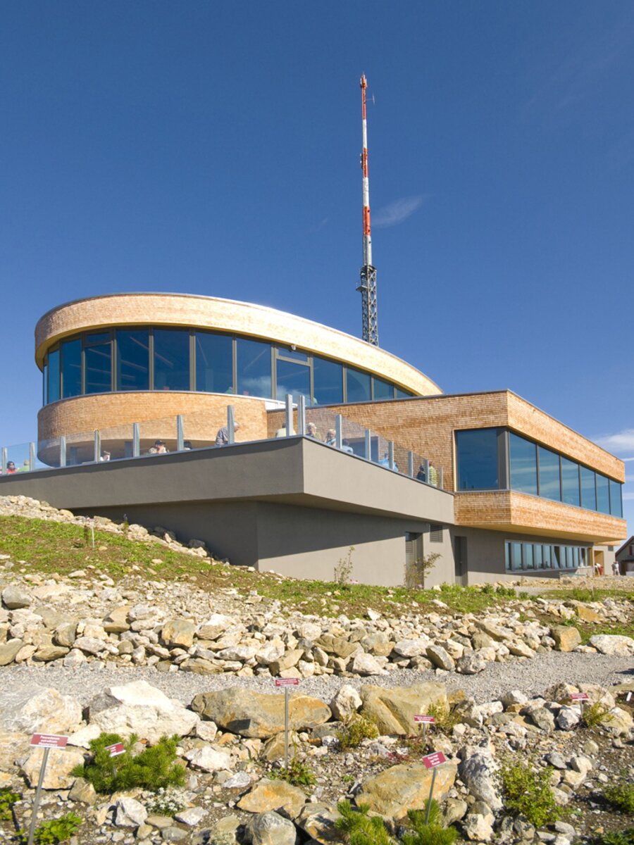 Im Gegensatz dazu ragt das Gipfelgeschoss mit dem Drehrestaurant darüber und bietet einen Rundumblick auf die Alpen, Täler und Seen. Das Erscheinungsbild des alpinen Baukörpers harmoniert durch wenige Materialen und zurückhaltende natürliche Farben mit der Natur.