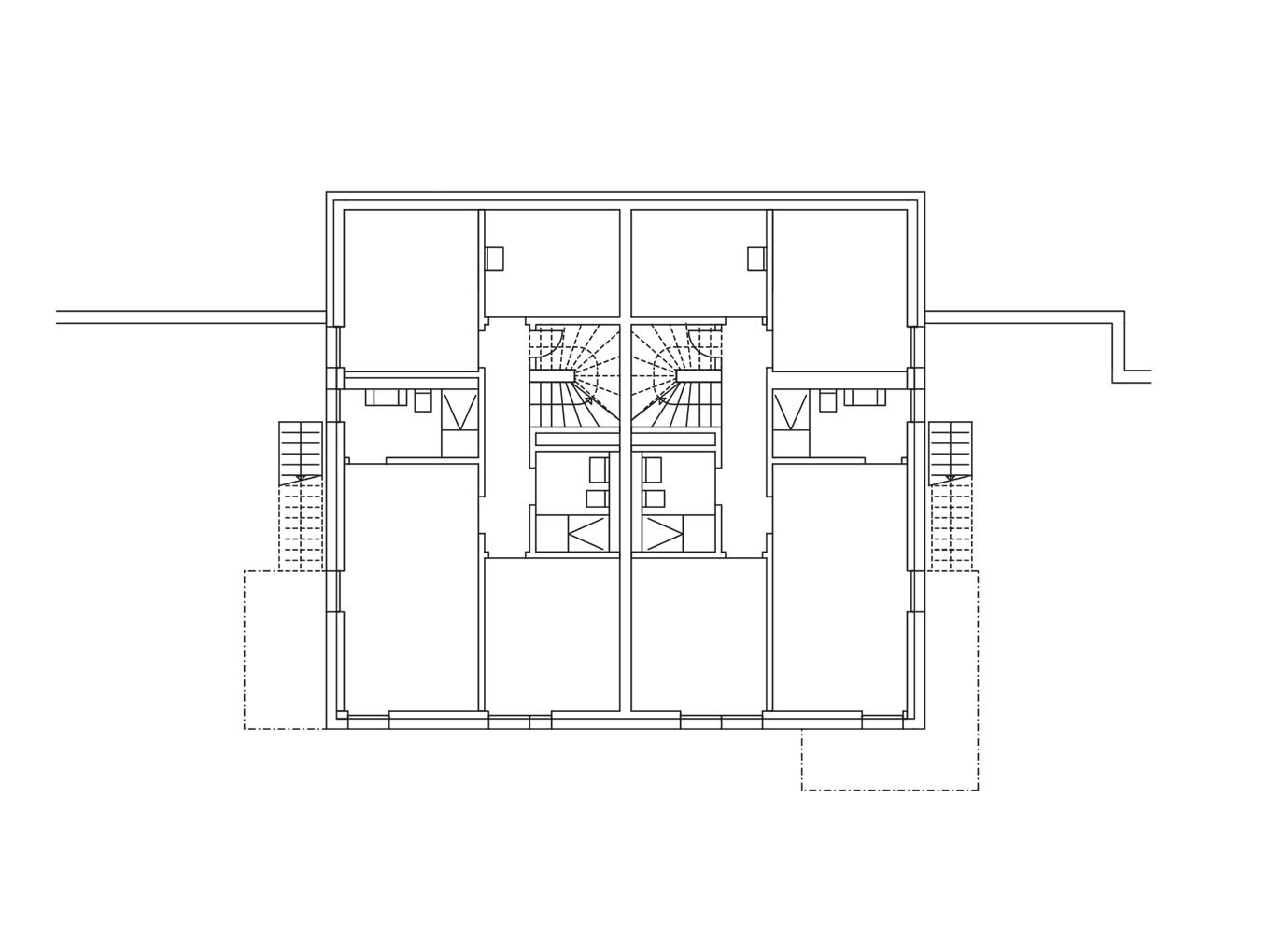 Drei Schwestern: Der Eingang der Doppel-Einfamilienhäuser befindet sich im Obergeschoss, wo sich auch die Küche und der Wohn- und Essbereich zugunsten der Aussicht befinden. Die «privaten» Räume wie Schlafzimmer und Bäder befinden sich im Erdgeschoss mit direktem Zugang zum Garten. Jedem Haus ist ein Carport mit zwei Abstellplätzen sowie ein zusätzlicher Besucherparkplatz zugewiesen. Jedes Haus verfügt über einen eigenen Garten.