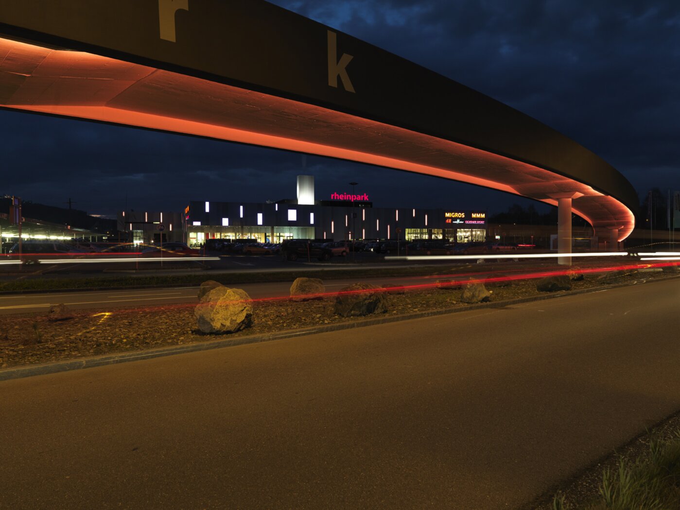 Das neue Gestaltungskonzept führte das Zentrum wieder zu seiner früheren Formgebung zurück und erreichte eine klare, kubische Gliederung. Zusätzliche Tages-Lichtquellen im Innern machen das Einkaufserlebnis im Rheinpark wieder attraktiver und moderner. Die Beleuchtung der neuen Fassade in der Nacht unterstützt die Fernwirkung – der Rheinpark ist der Blickfang in der Umgebung.
