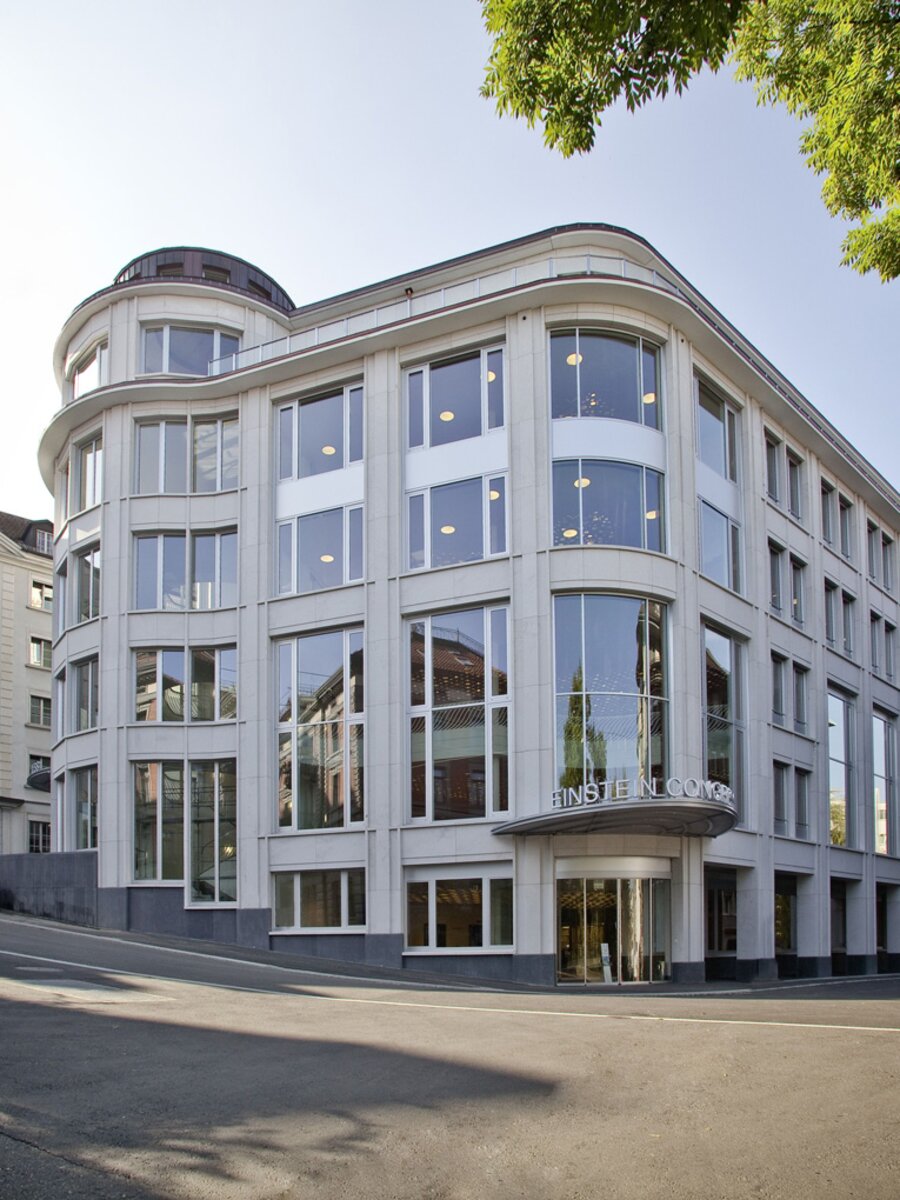 Der zeitgenössische Bau fügt sich ins Ensemble des klassizistischen Stammhauses Einstein Hotel am Rande des historischen Klosterviertels von St. Gallen ein.