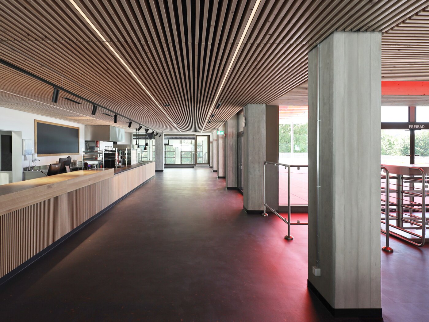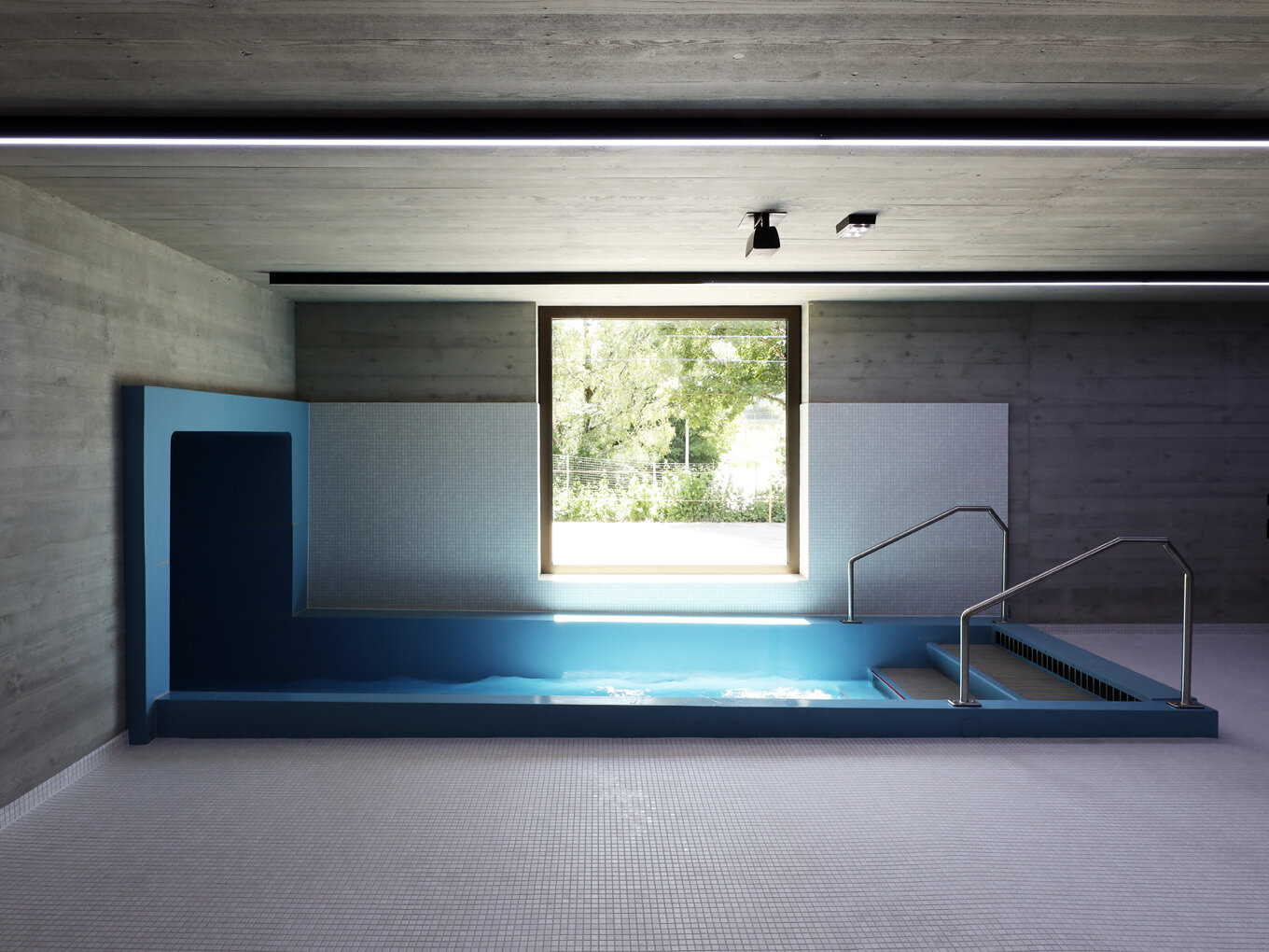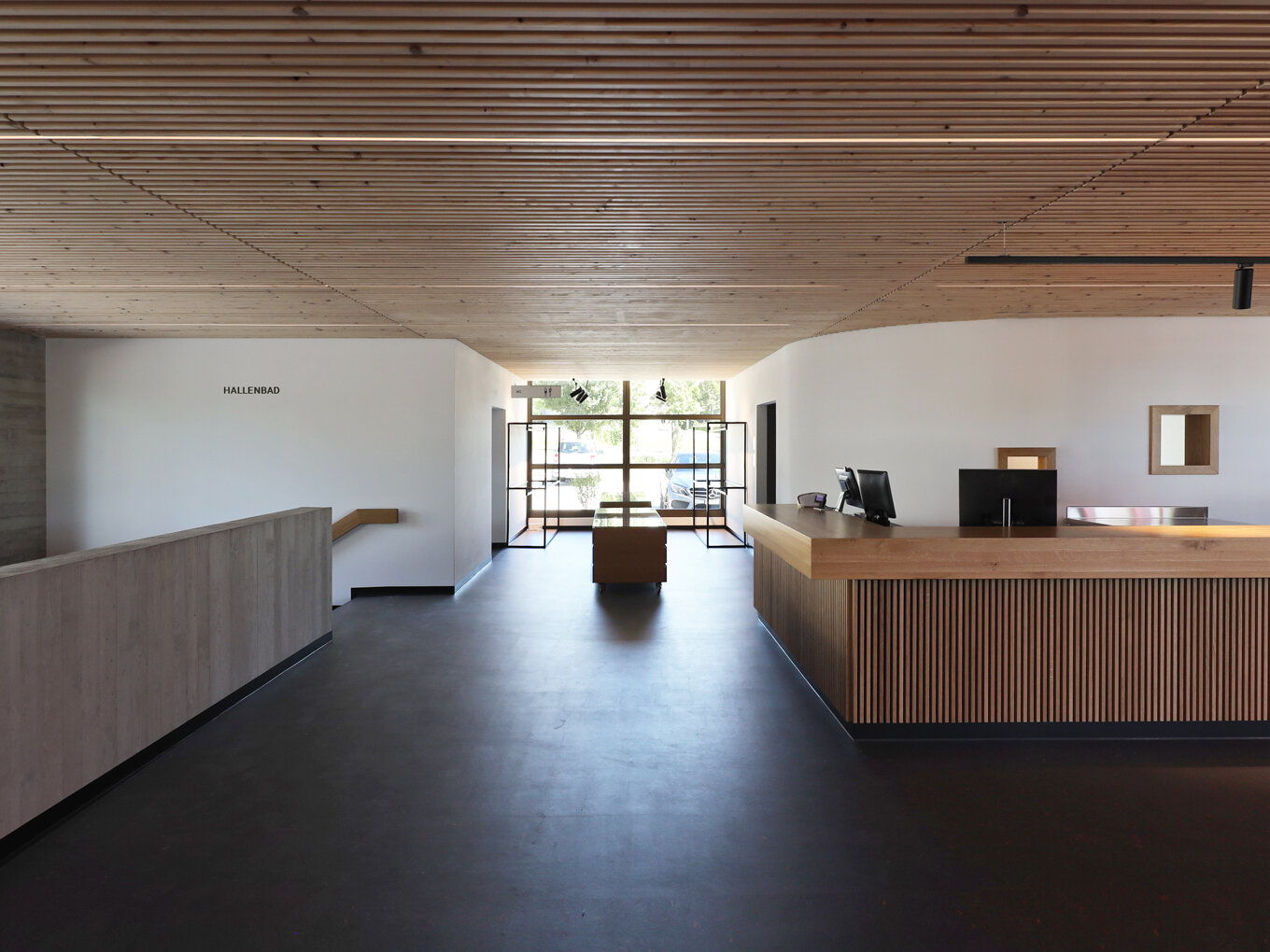 Der neu gestaltete Eingangsbereich dient als zentrale Drehscheibe, welche das Hallenbad, die Sauna- und Wellnessanlage, das Bistro sowie das Freibad erschliesst. Westseitig wurde die Anlage, unter Berücksichtigung des bestehenden Gebäuderasters, um einen Wellnessbereich mit Saunahof erweitert. Garderoben, Duschen und Nebenräume erfuhren eine Reorganisation und sind nun behindertengerecht zugänglich. Die gesamte Haus- und Badewassertechnik wurde ersetzt. Ein besonderes Highlight stellt das neue Warmwasser-Aussenbecken dar, das durch eine Schleuse vom Hallenbad aus erreicht werden kann. Massageliegen und Sprudeldüsen bieten den Badegästen auch bei kalten Temperaturen Entspannung im Aussenbereich.