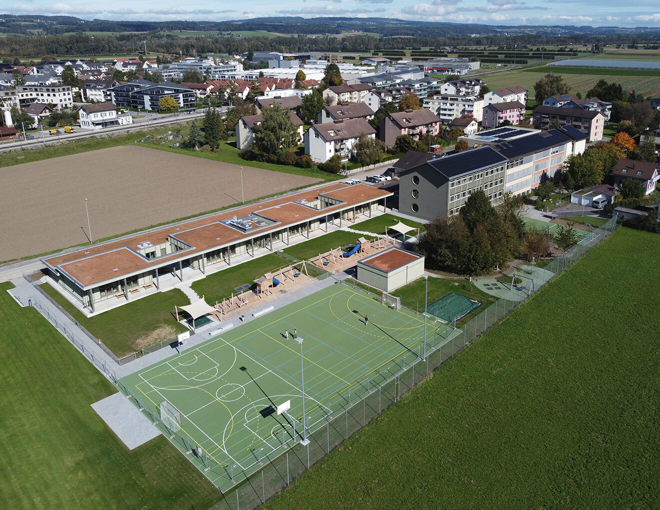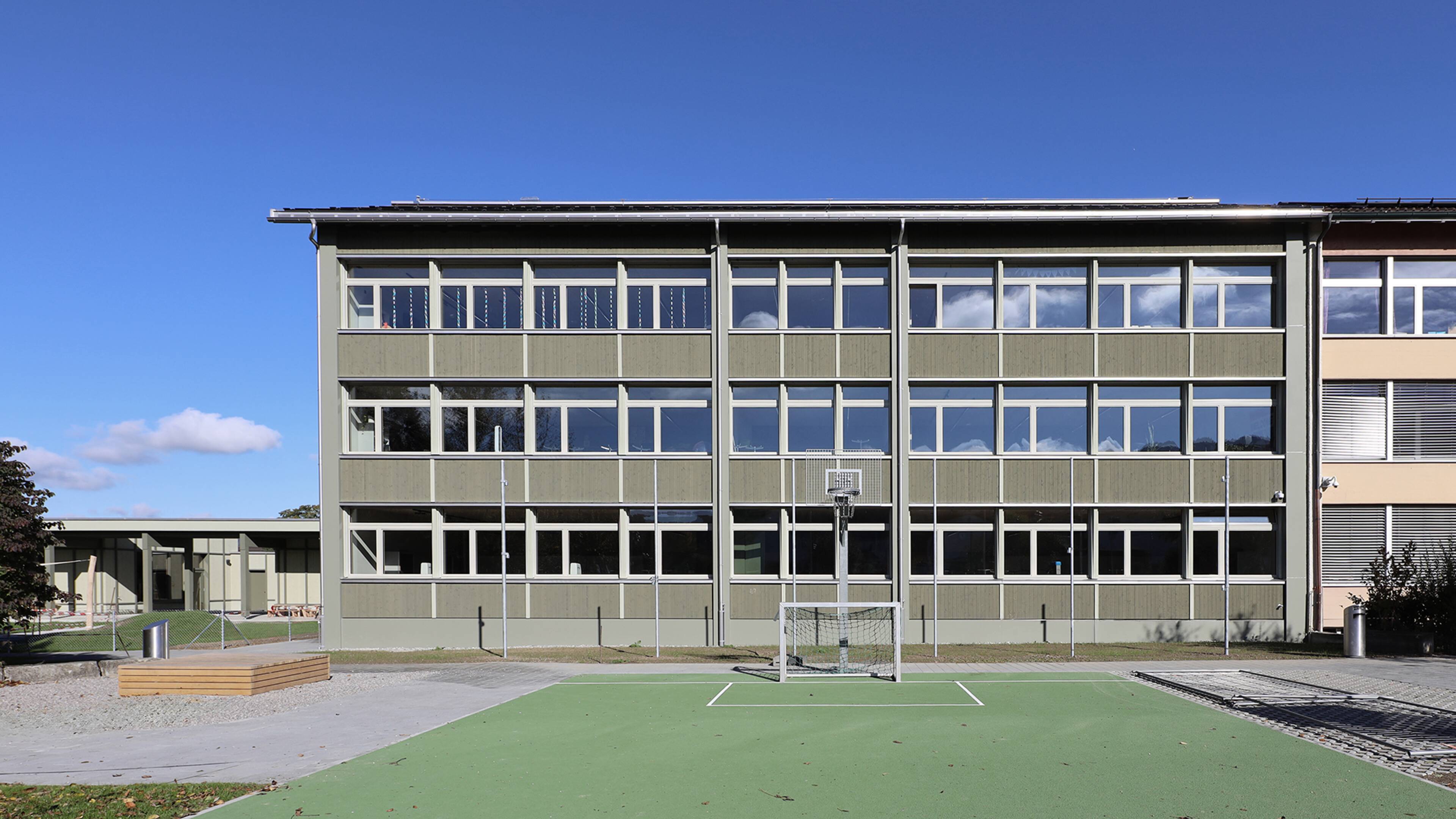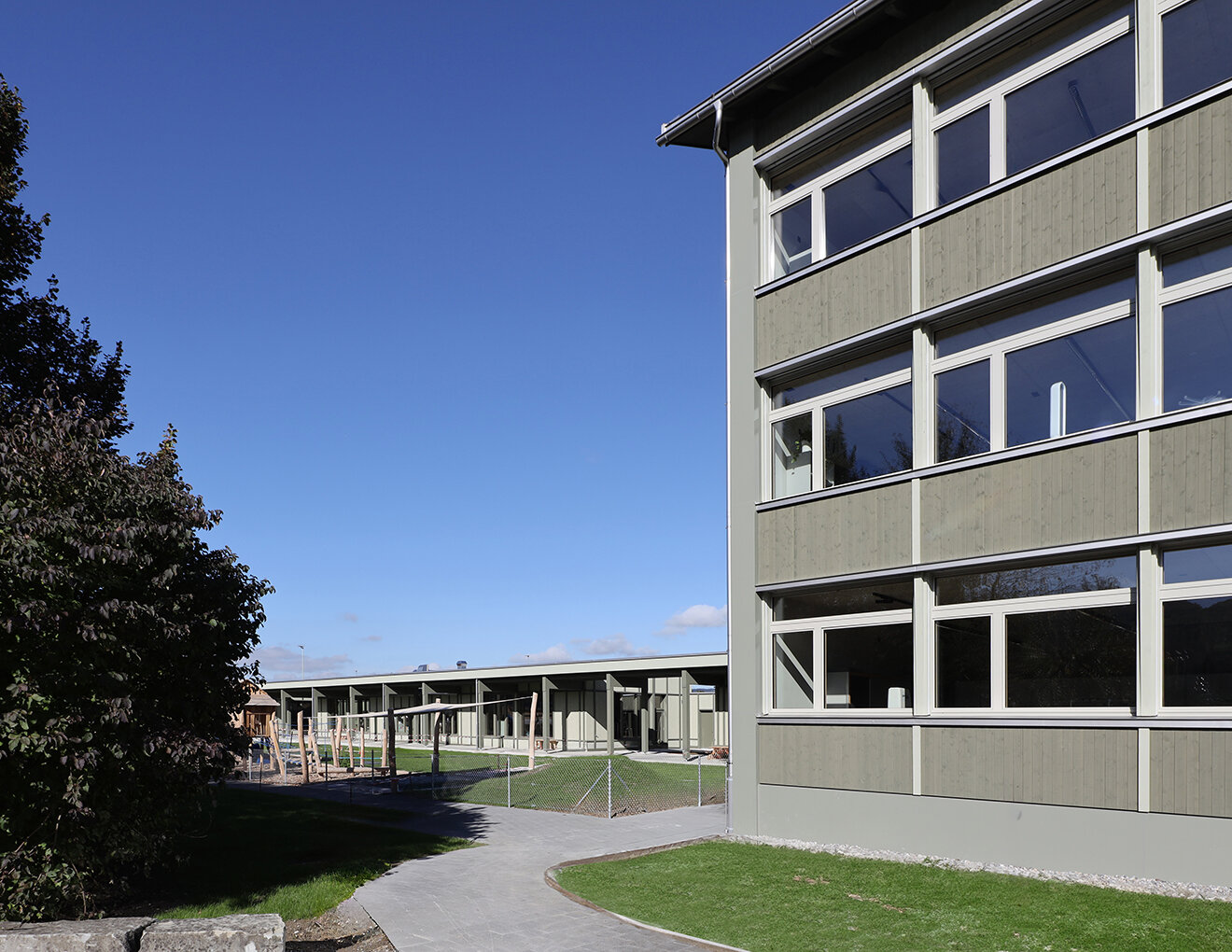 Der Erweiterungsbau vereint neue Räume für Sprachen, Handwerk und vier Kindergärten unter einem Dach. Die Schulanlage von 1961 wurde in ihrer Grundordnung weitergeführt, in der Länge ergänzt und aufgestockt. So entstand ein harmonisches Ensemble, das Bestehendes respektierte und zeitgemäss interpretierte.