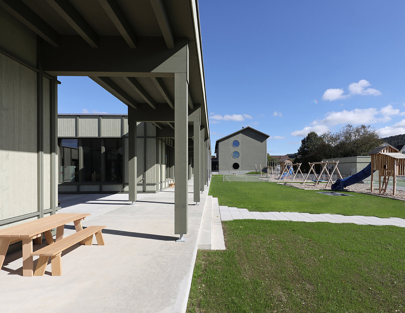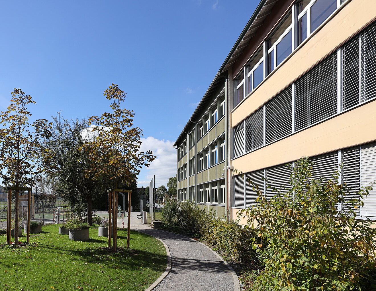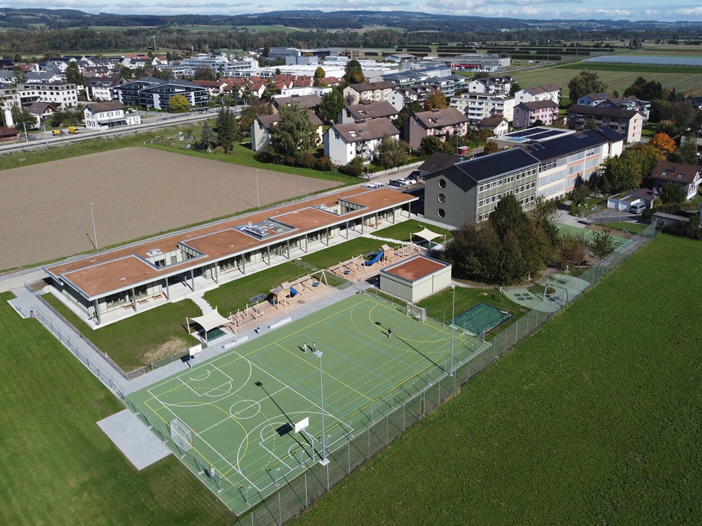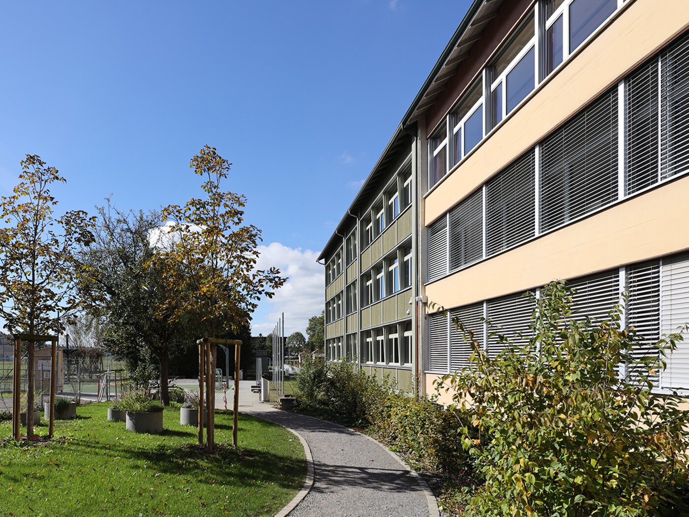 Der Erweiterungsbau vereint neue Räume für Sprachen, Handwerk und vier Kindergärten unter einem Dach. Die Schulanlage von 1961 wurde in ihrer Grundordnung weitergeführt, in der Länge ergänzt und aufgestockt. So entstand ein harmonisches Ensemble, das Bestehendes respektierte und zeitgemäss interpretierte.