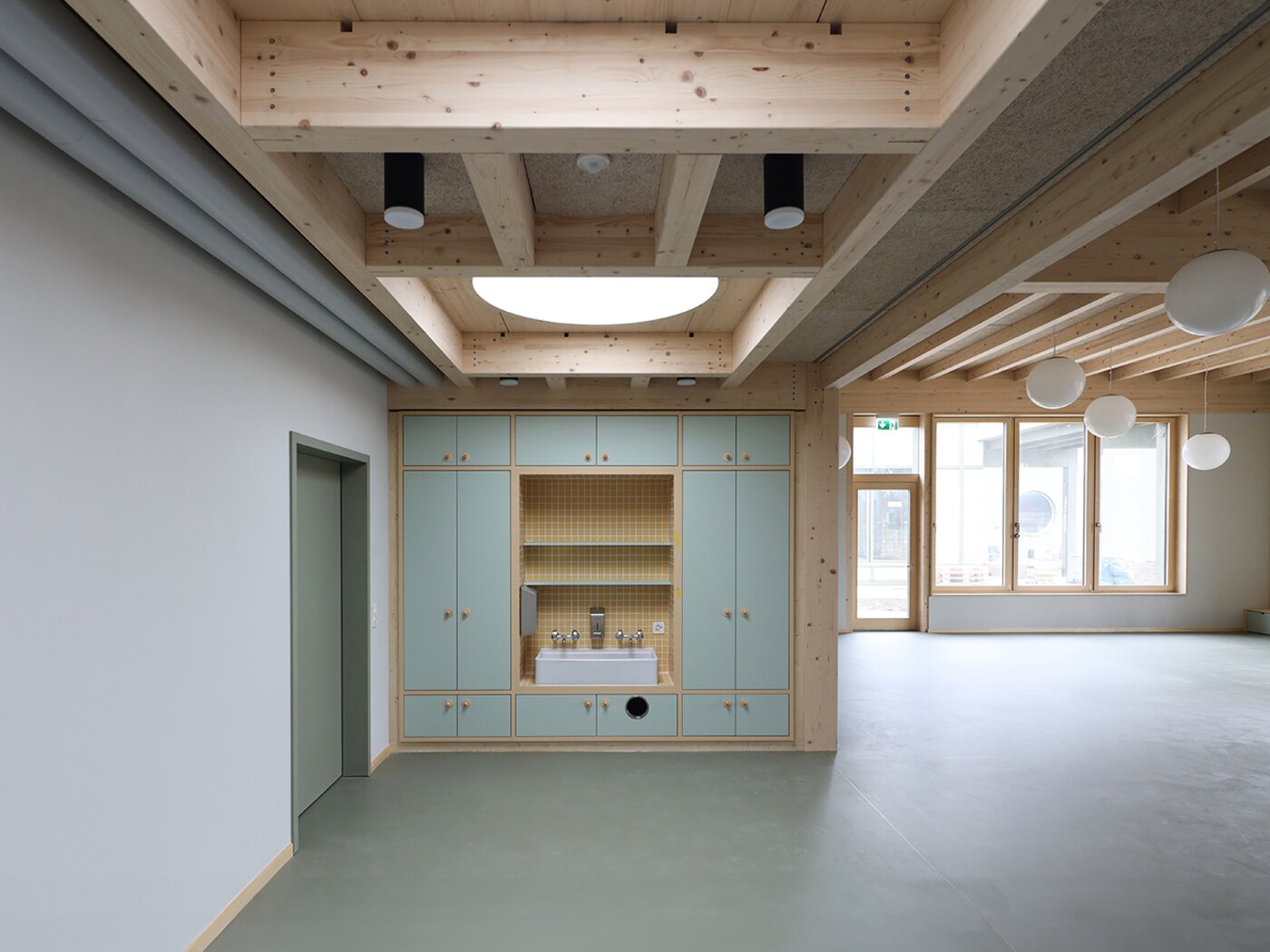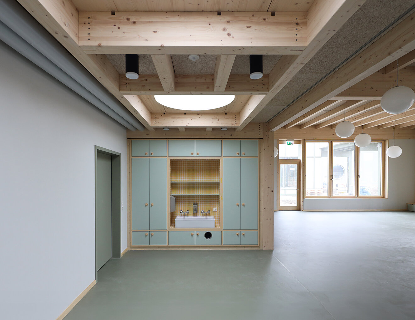 Für den Kindergartenbereich kam ein additives System zum Einsatz, das allen vier Einheiten gleiche Qualität bot. Das eingeschossige, pavillonartige Holzgebäude schuf eine warme, überschaubare Welt mit direktem Bezug zum Aussenraum und zur Natur. Das gemeinsame Gartenzimmer, jeweils von zwei Kindergärten genutzt, wurde zum sinnlichen Zwischenraum und zu einem Ort für Entdeckung, Licht und Wachstum.