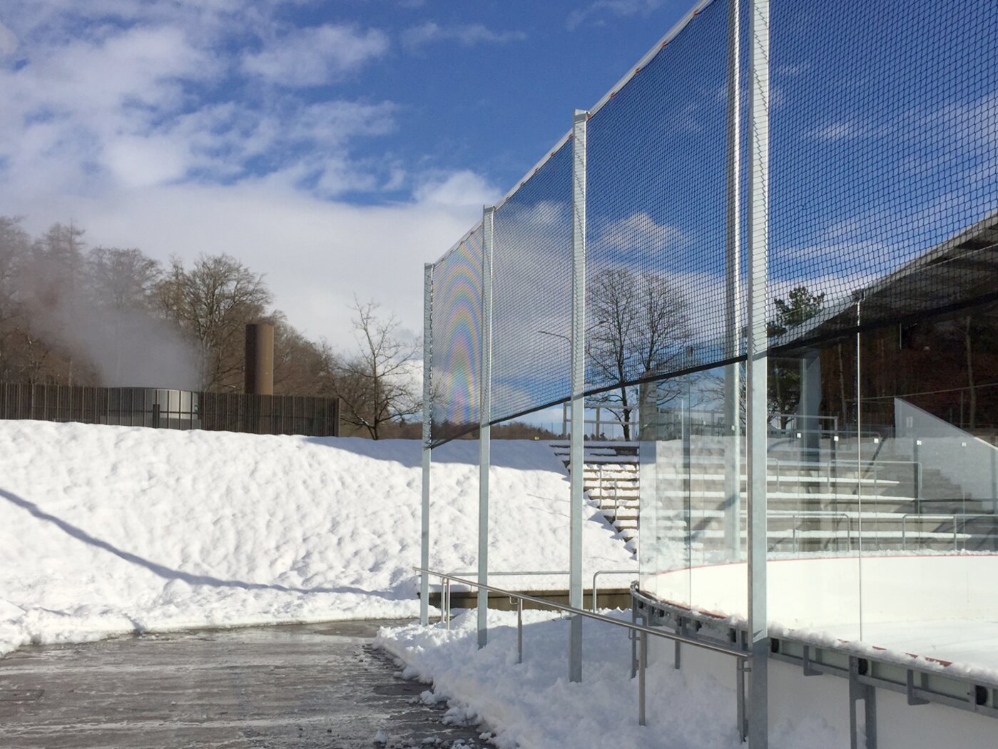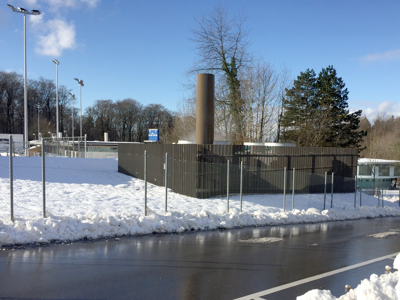 Im Norden der Anlage wurde hierfür eine Rückkühlanlage erstellt, die mit hochwertigen, transparenten Metallprofilplatten verkleidet wurde. Darunter wurde für die komplett erneuerte Kanalisation der Kunsteisbahn ein Retentionsbecken gebaut.