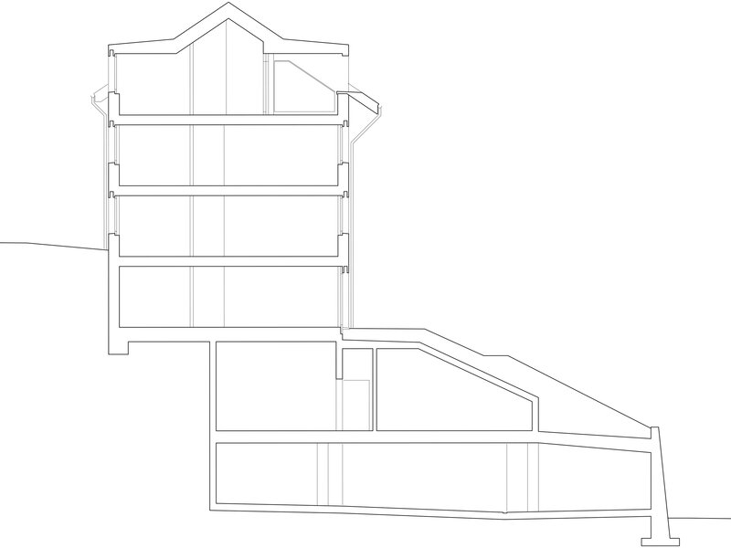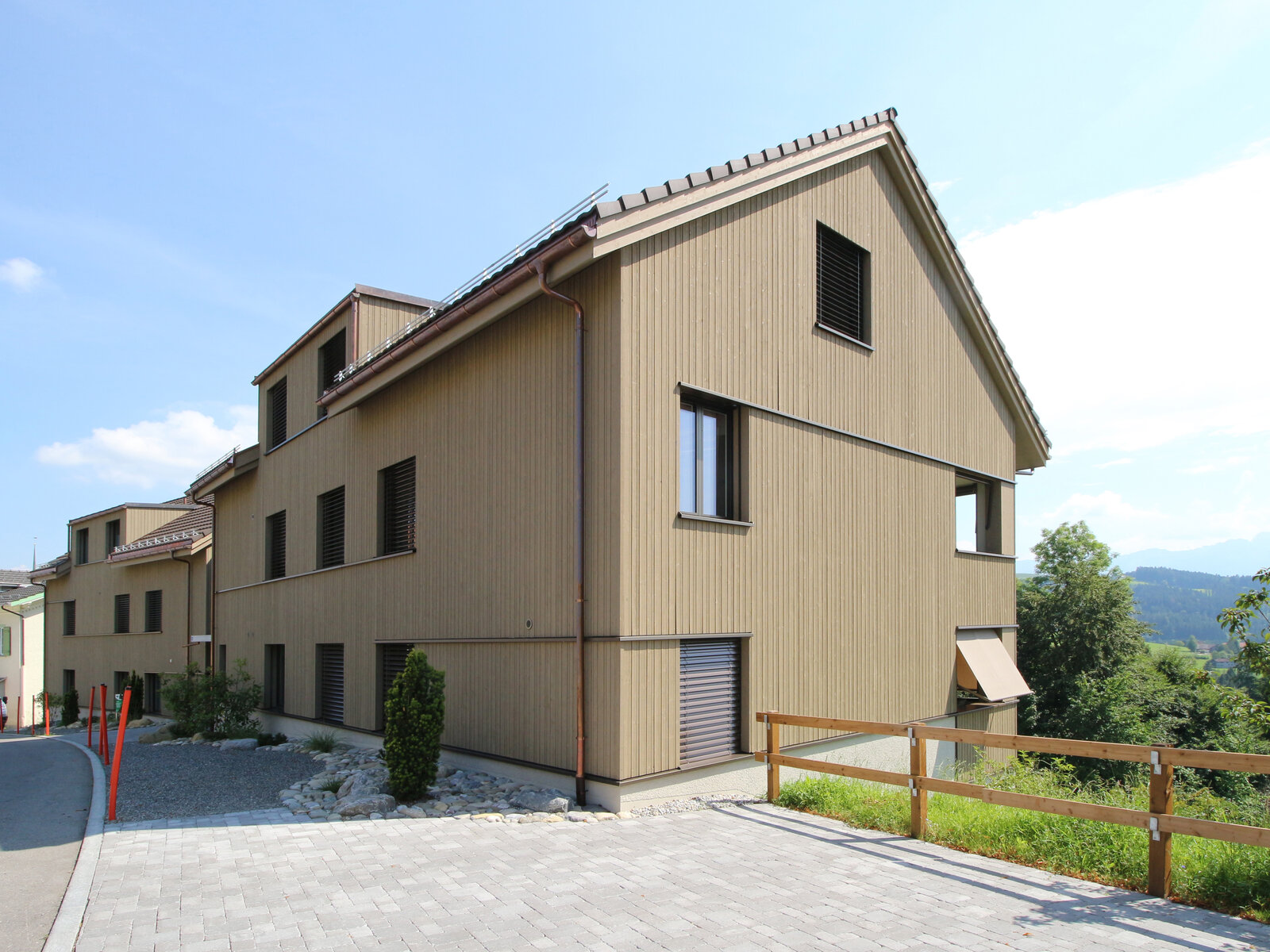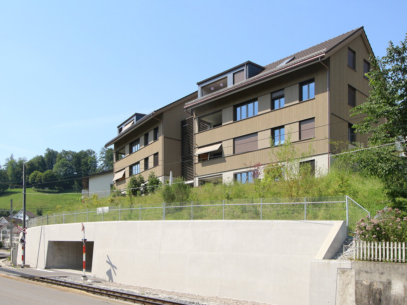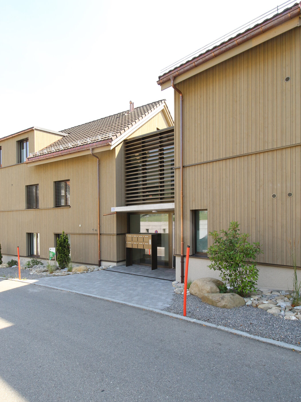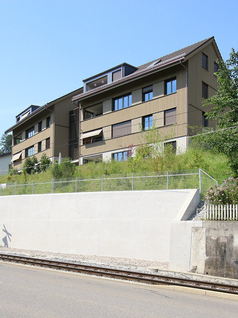Die beiden Wohngebäude mit jeweils 4 Wohnungen ähneln in ihrer Kubatur den ursprünglich vorhandenen Gebäuden und folgen in ihrer Stellung dem Strassenverlauf. Das Treppenhaus steht zurückversetzt zwischen den Gebäuden und erschliesst - ausser im Dachgeschoss - alle Wohnungen behindertengerecht. Unter dem Sockelgeschoss, welches sich nur hangseitig öffnet, befinden sich im 1.UG die allgemeinen und privaten Kellerräume. In einem weiteren Untergeschoss ist die Tiefgarage mit 11 Stellplätzen und Veloraum, in die von der Hauptstrasse eingefahren wird.