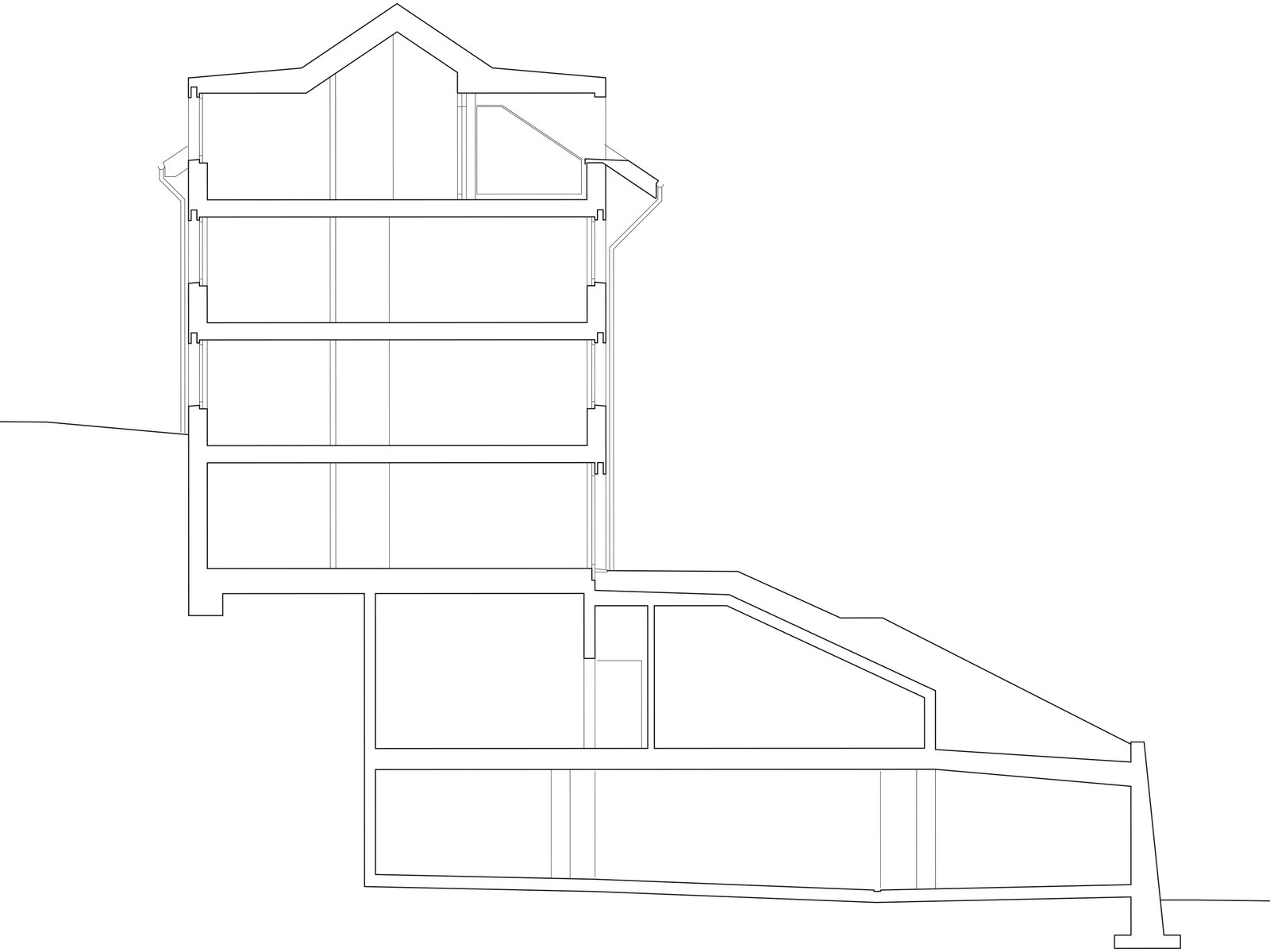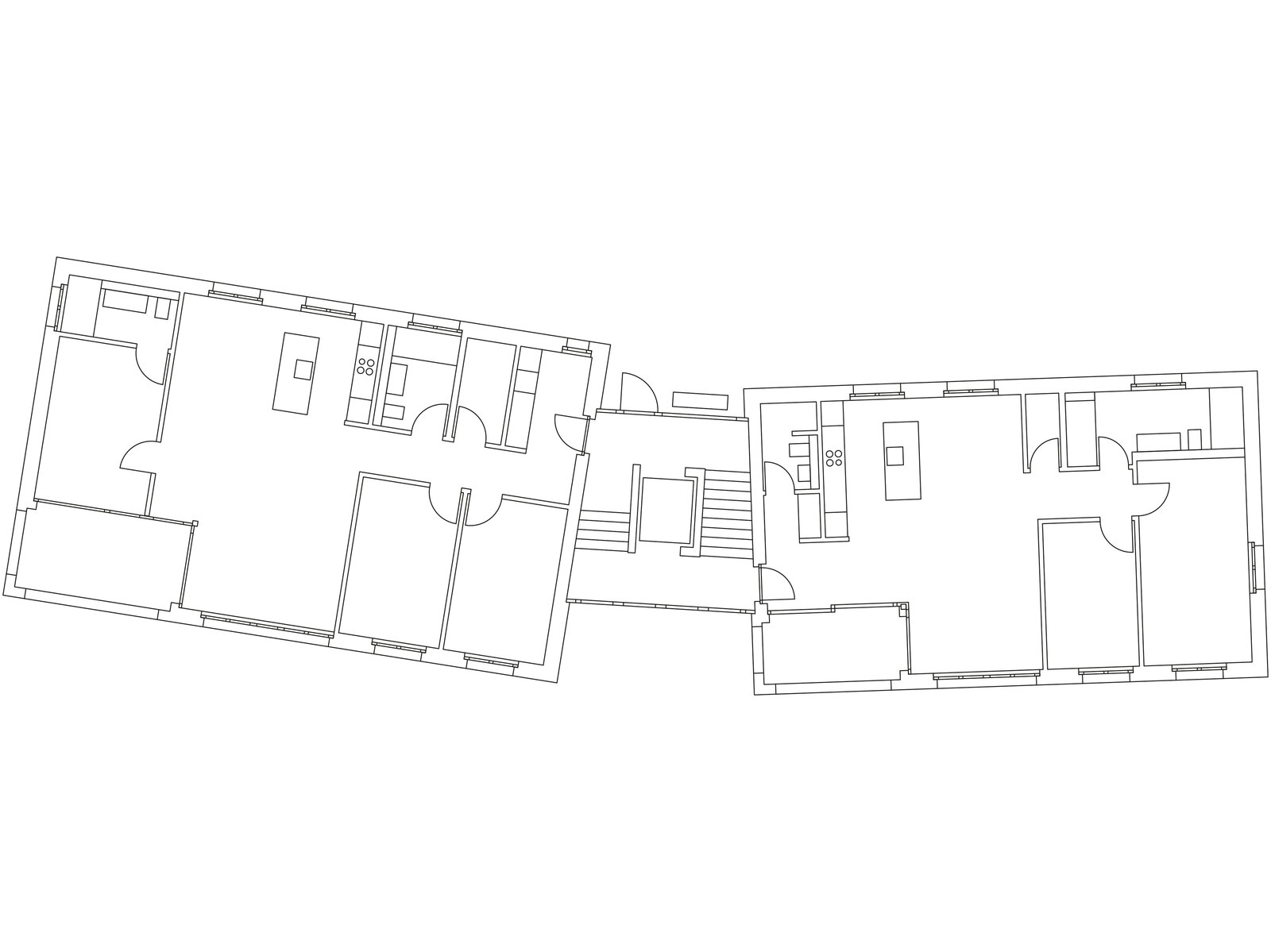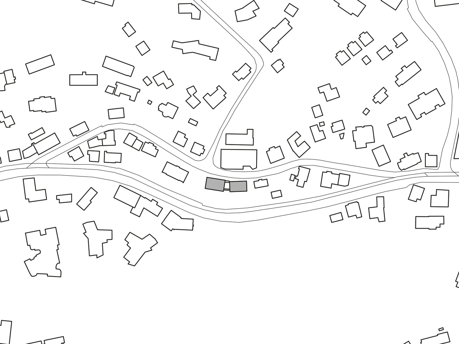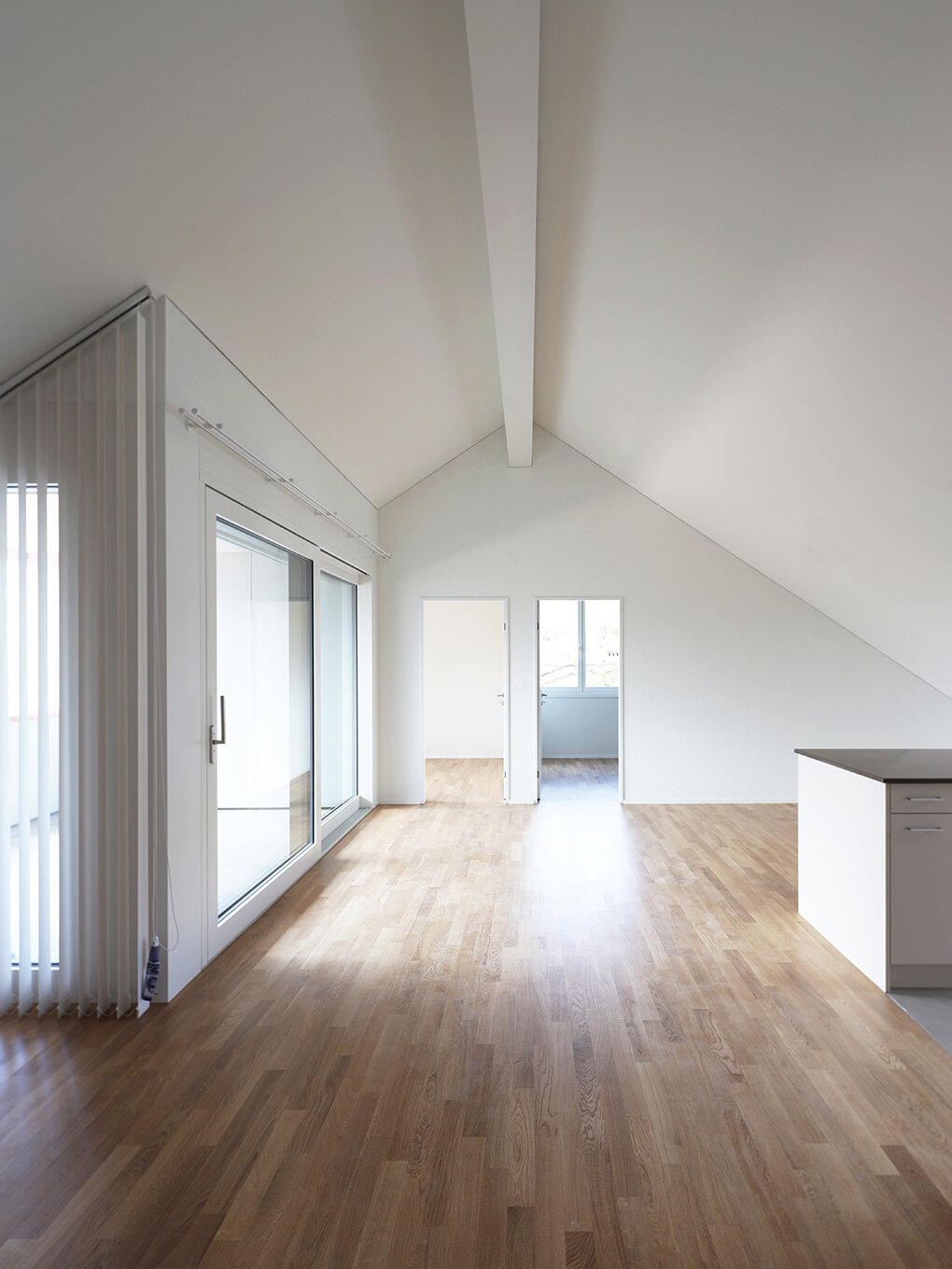 Die beiden Wohngebäude mit jeweils 4 Wohnungen ähneln in ihrer Kubatur den ursprünglich vorhandenen Gebäuden und folgen in ihrer Stellung dem Strassenverlauf. Das Treppenhaus steht zurückversetzt zwischen den Gebäuden und erschliesst - ausser im Dachgeschoss - alle Wohnungen behindertengerecht. Unter dem Sockelgeschoss, welches sich nur hangseitig öffnet, befinden sich im 1.UG die allgemeinen und privaten Kellerräume. In einem weiteren Untergeschoss ist die Tiefgarage mit 11 Stellplätzen und Veloraum, in die von der Hauptstrasse eingefahren wird.