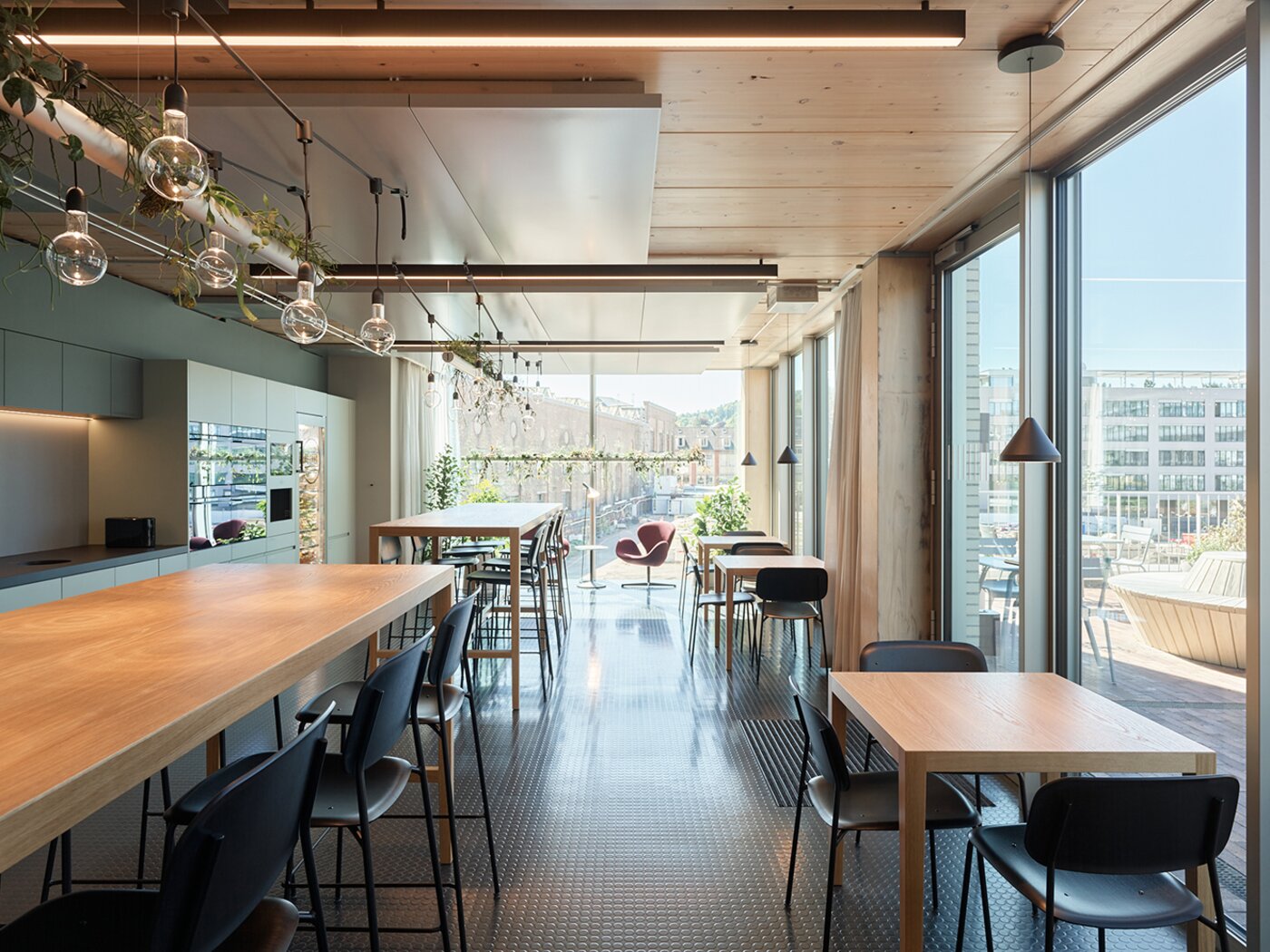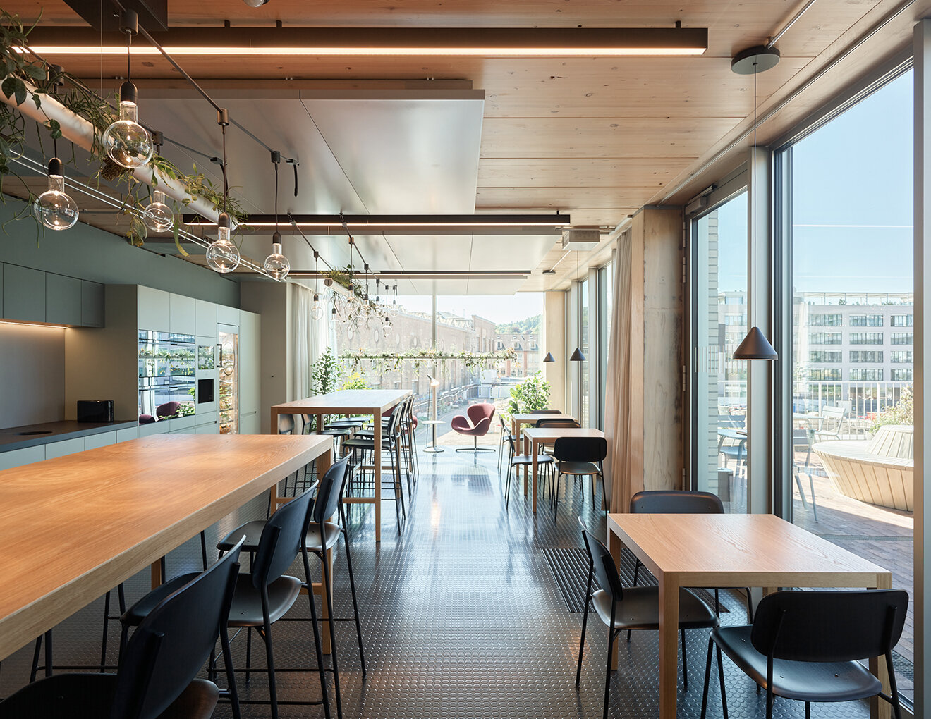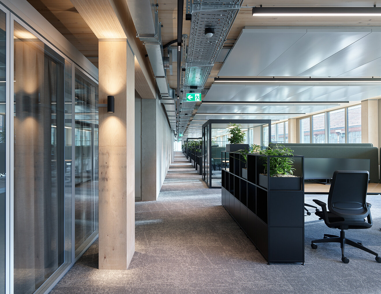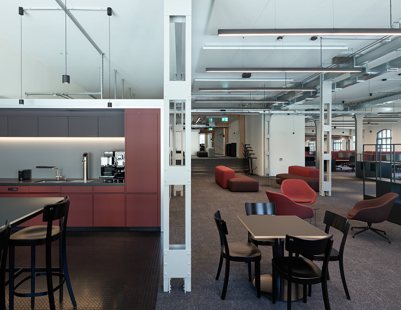 Auf einer Fläche von rund 11’000 m2 entstanden rund 500 attraktive und moderne Arbeitsplätze. Es stehen den SWICA Mitarbeitenden neben den ergonomischen Arbeitsplätzen auch Fokusräume, unter-schiedlichste Sitzungszimmer, Cafeterias und gemütliche Terrassen zur Verfügung. In den zwei überhohen Hallen entstanden Zonen für Projekt- und Kreativarbeit, welche durch raumhohe Vorhänge unter-teilbar sind. Im Erdgeschoss befindet sich das neue Schulungs- und Konferenzzentrum der SWICA. Die Kundinnen und Kunden werden im neu inszenierten historischen Portikus empfangen und beraten.