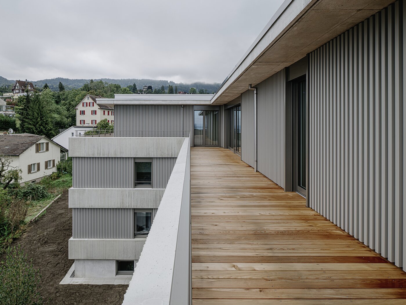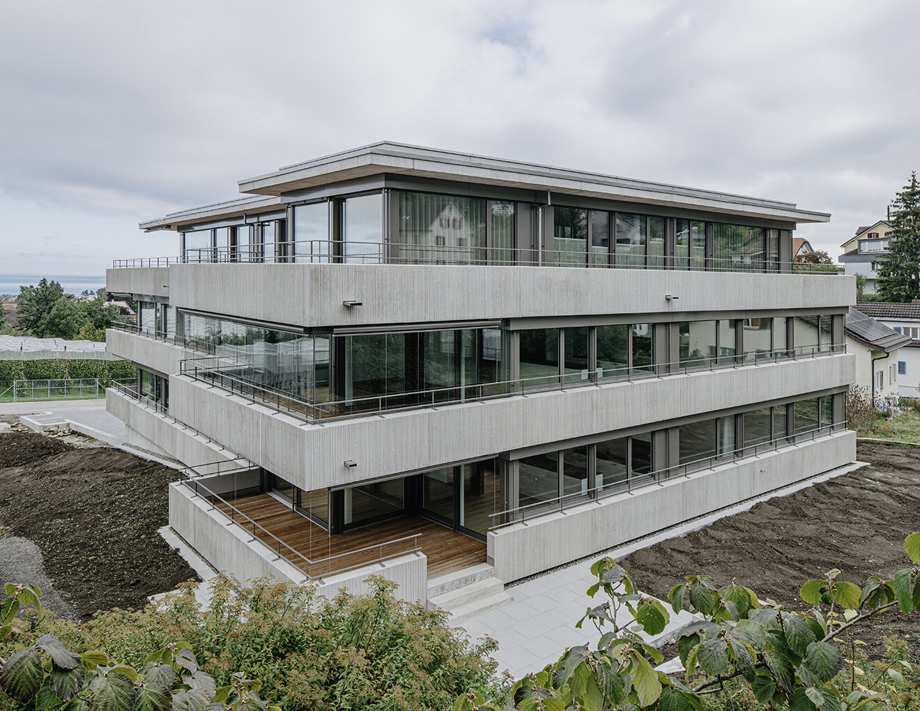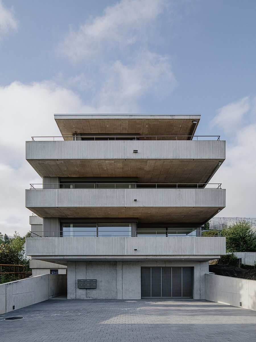 RLC erhielt den Auftrag für die Planung und Realisierung eines Mehrfamilienhauses mit 5 Wohnungen. Die Parzelle mit Hanglage, liegt angrenzend an die Landwirtschaftszone und bietet einen atemberaubenden Blick auf den Bodensee. Das T-förmige Volumen fügt sich harmonisch in den Hang ein und berücksichtigt durch die horizontale Gliederung die umliegende Landschaft. Das Projekt verbindet moderne Architektur mit einer respektvollen Einbettung in die Landschaft
