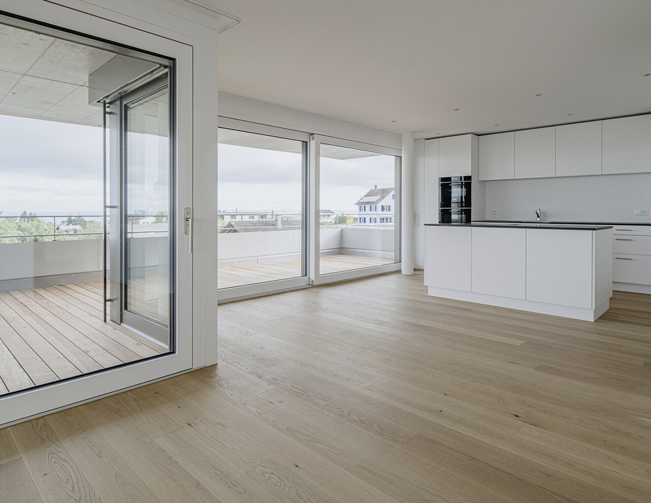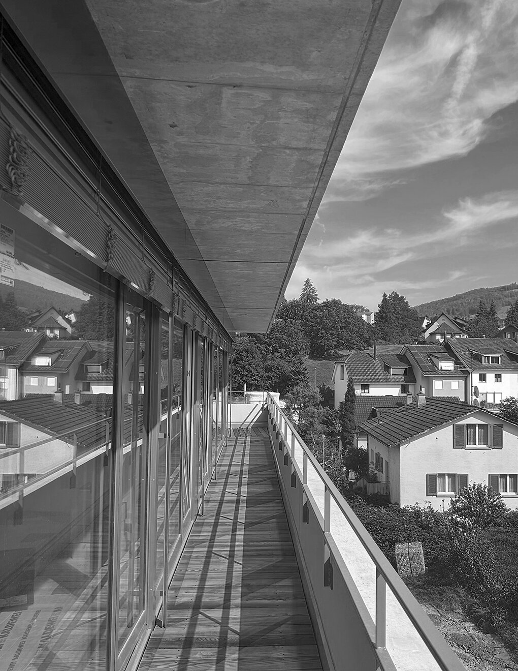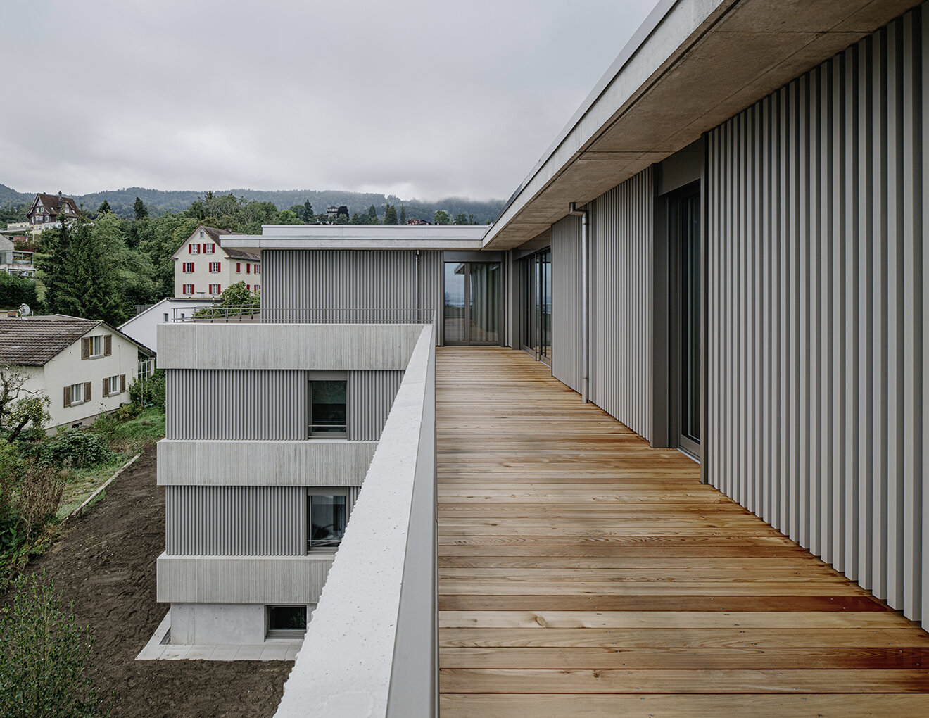 RLC erhielt den Auftrag für die Planung und Realisierung eines Mehrfamilienhauses mit 5 Wohnungen. Die Parzelle mit Hanglage, liegt angrenzend an die Landwirtschaftszone und bietet einen atemberaubenden Blick auf den Bodensee. Das T-förmige Volumen fügt sich harmonisch in den Hang ein und berücksichtigt durch die horizontale Gliederung die umliegende Landschaft. Das Projekt verbindet moderne Architektur mit einer respektvollen Einbettung in die Landschaft