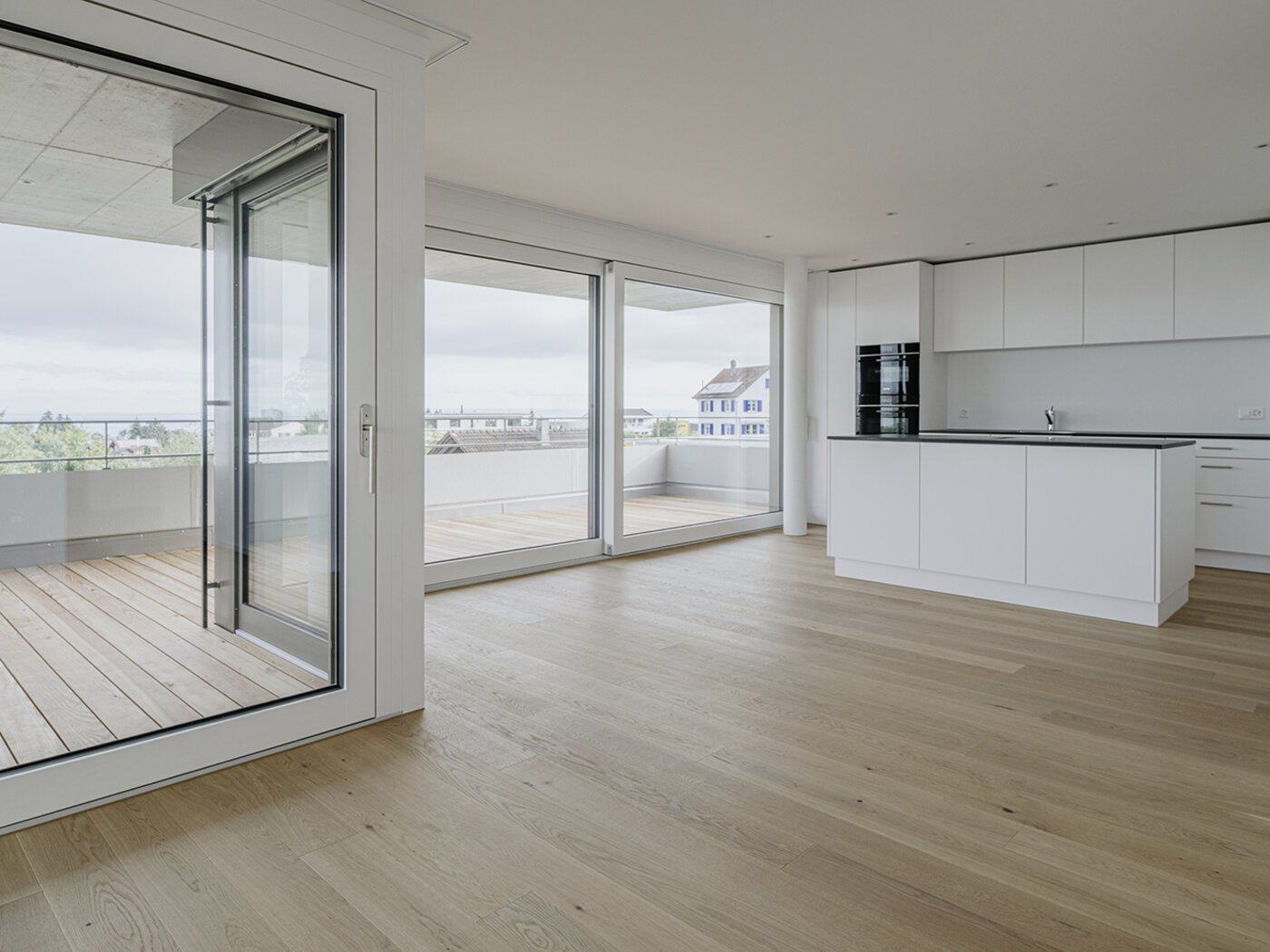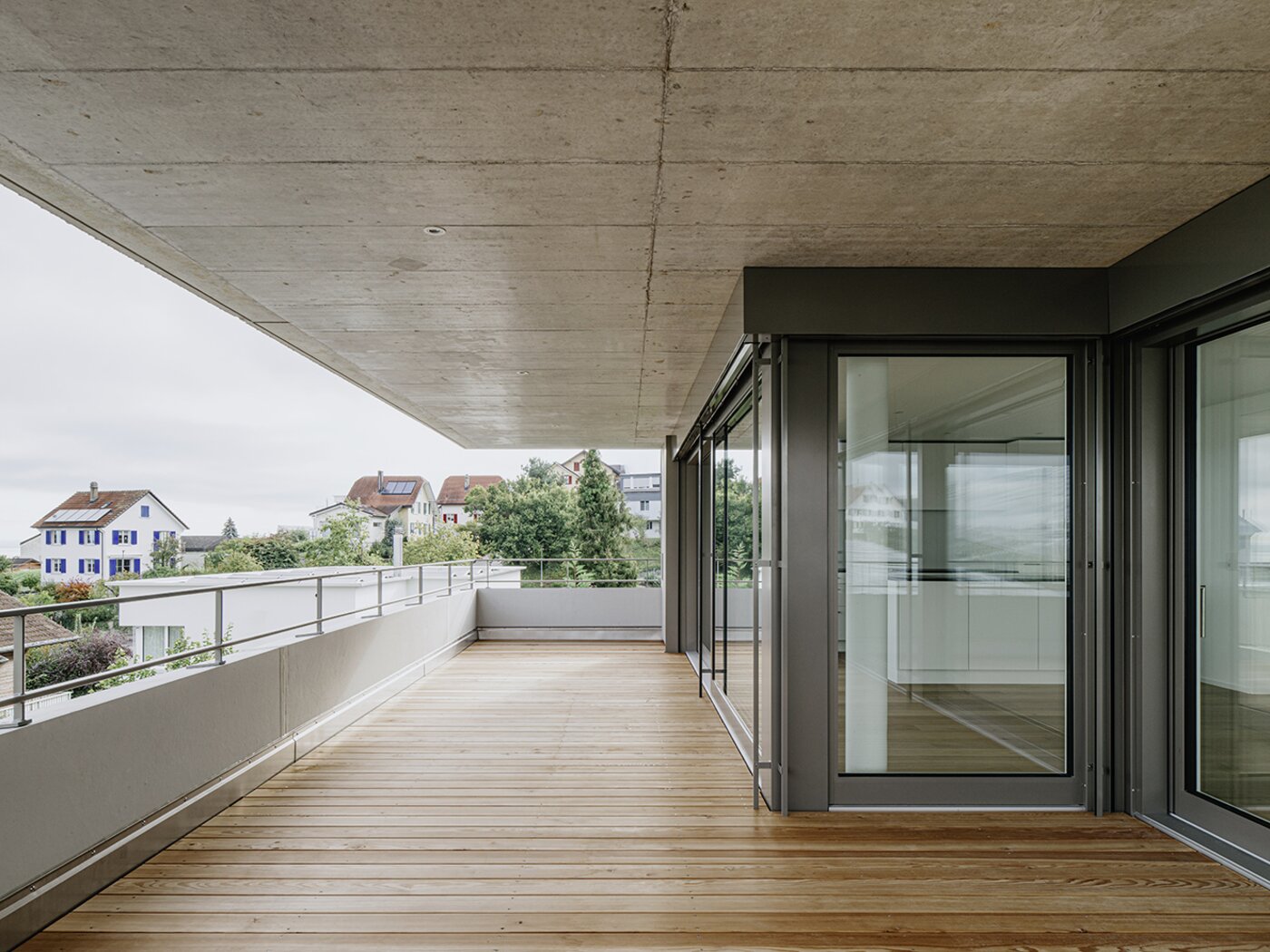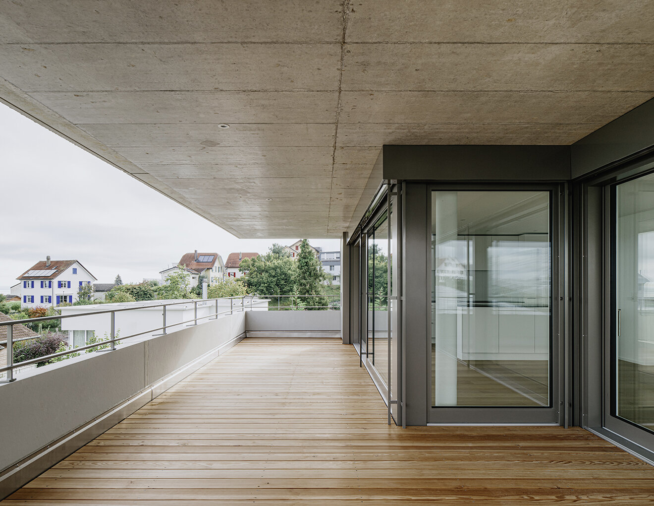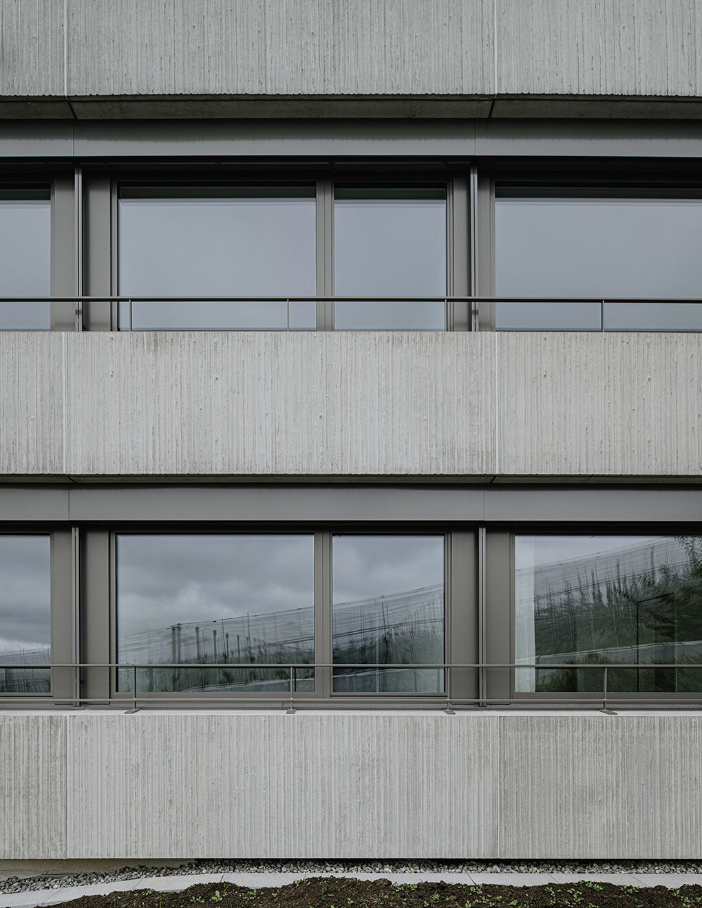 Die Fassade zeigt sich zur Wohngebietsseite geschlossen, während die Ausrichtungen nach Süden, Westen und Norden grosszügig verglast sind und den Blick auf Landschaft und Bodensee freigeben. Umlaufende Betonbrüstungen mit vertikalen Matrizeneinlagen und eine vertikale Metallfassade verleihen dem Gebäude einen skulpturalen Ausdruck. Die klare Gestaltung im Innern mit den weissen Decken, Wänden und Einbauten rücken in den Hintergrund, das einfallende Licht und der Blick nach Aussen stehen im Vordergrund.