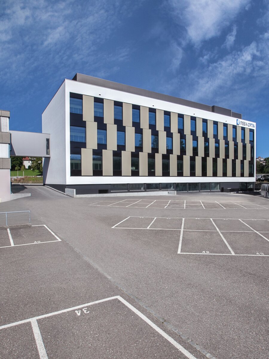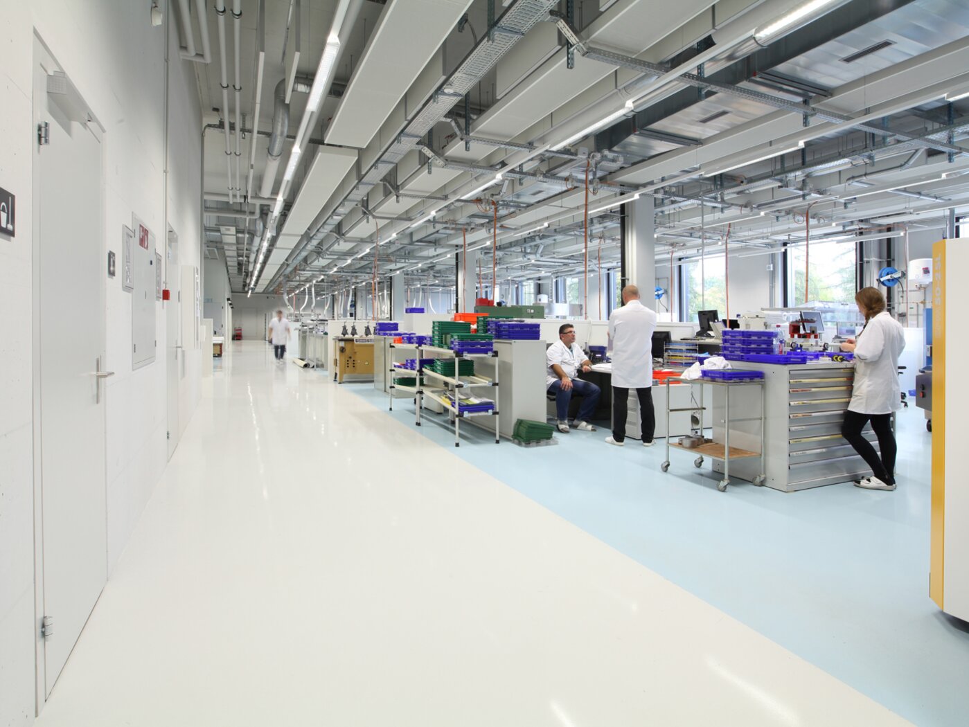 Auf vier Geschossen entstanden rund 4‘400 m2 modernste Produktionsflächen. Die offene Struktur der Räume lässt eine grösstmögliche flexible Nutzung zu. Mit diesem Raumkonzept kann die FISBA OPTIK künftig jederzeit auf die Veränderungen ihrer Produktionsprozesse reagieren.