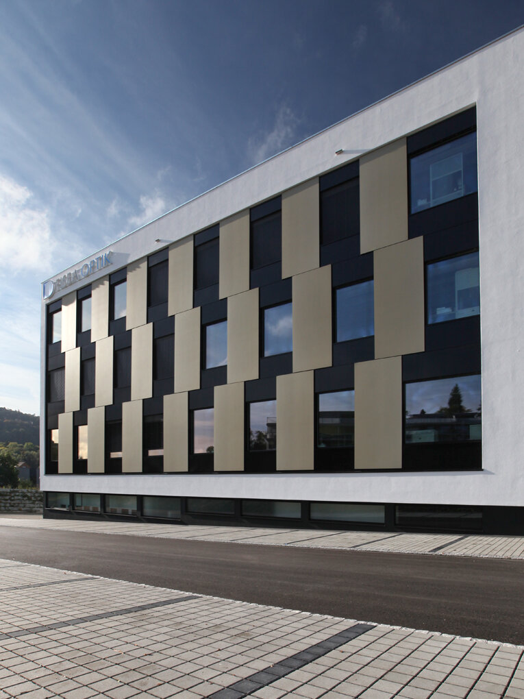 Die Fassade nimmt die vertikale Struktur des Hauptgebäudes auf. Abwechselnd offene und geschlossene, in den Geschossen horizontal verschobene Elemente ergeben eine spannungsvolle Gestaltung.