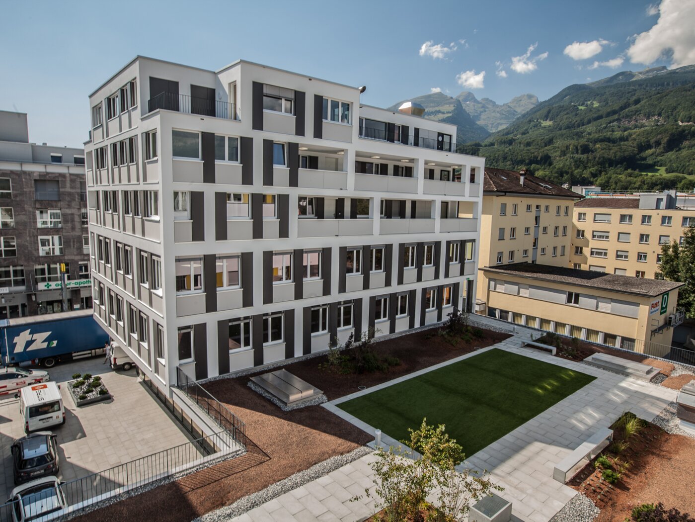 Das Grundstück liegt mitten im Herzen von Buchs an zentralster Lage an der Bahnhofstrasse und profitiert von allen Vorteilen dieser Zentrumslage.