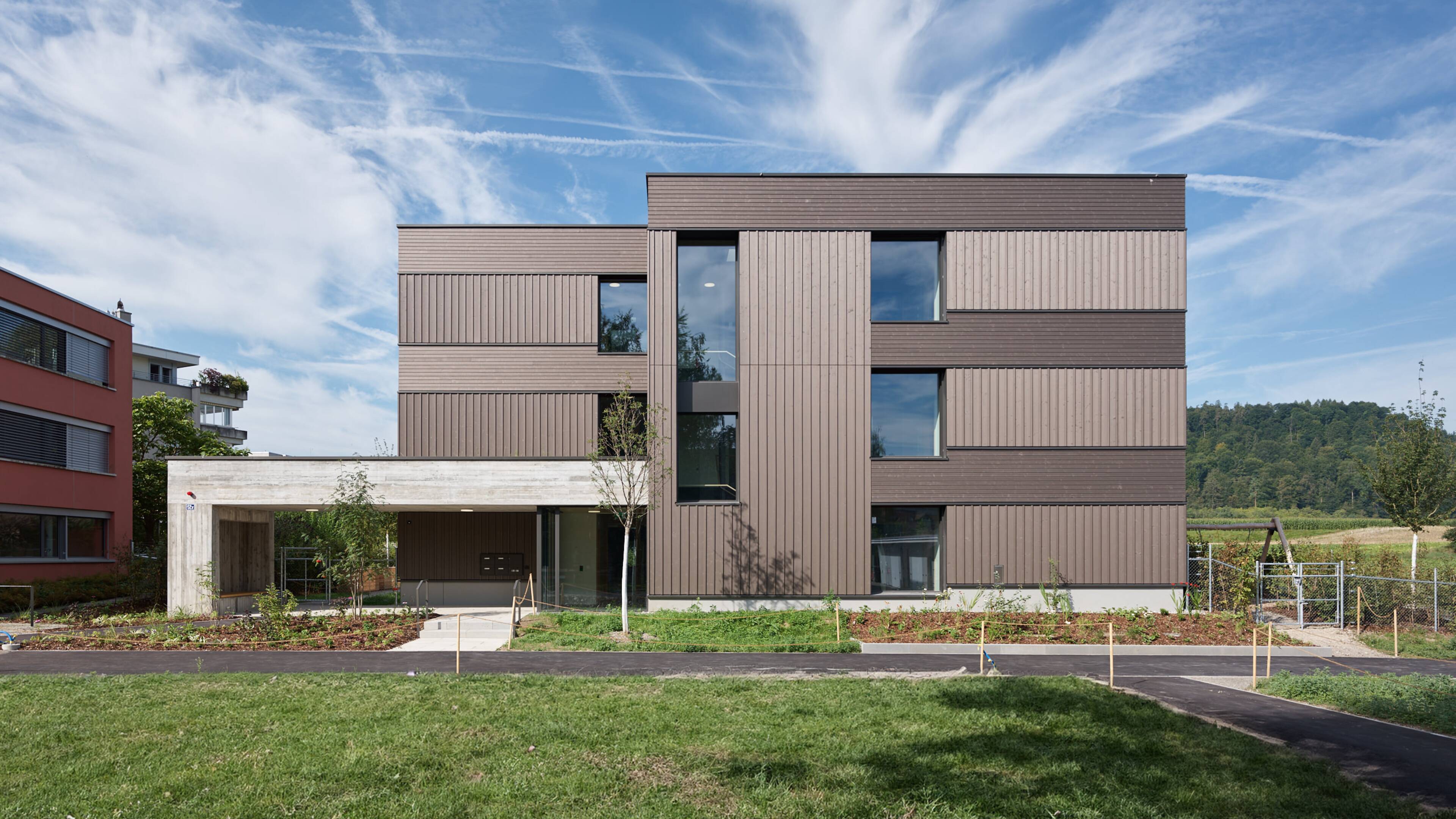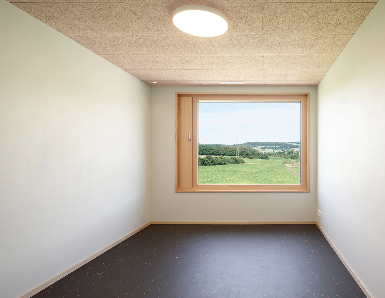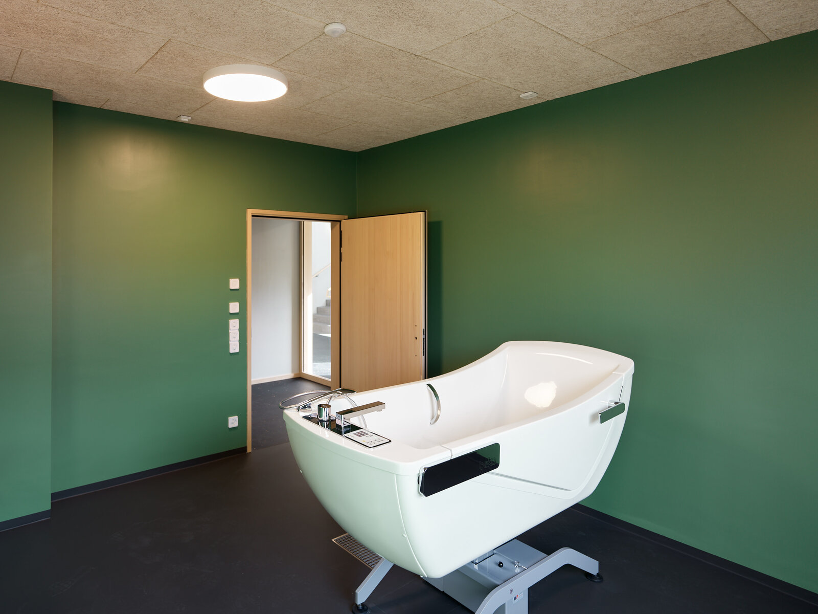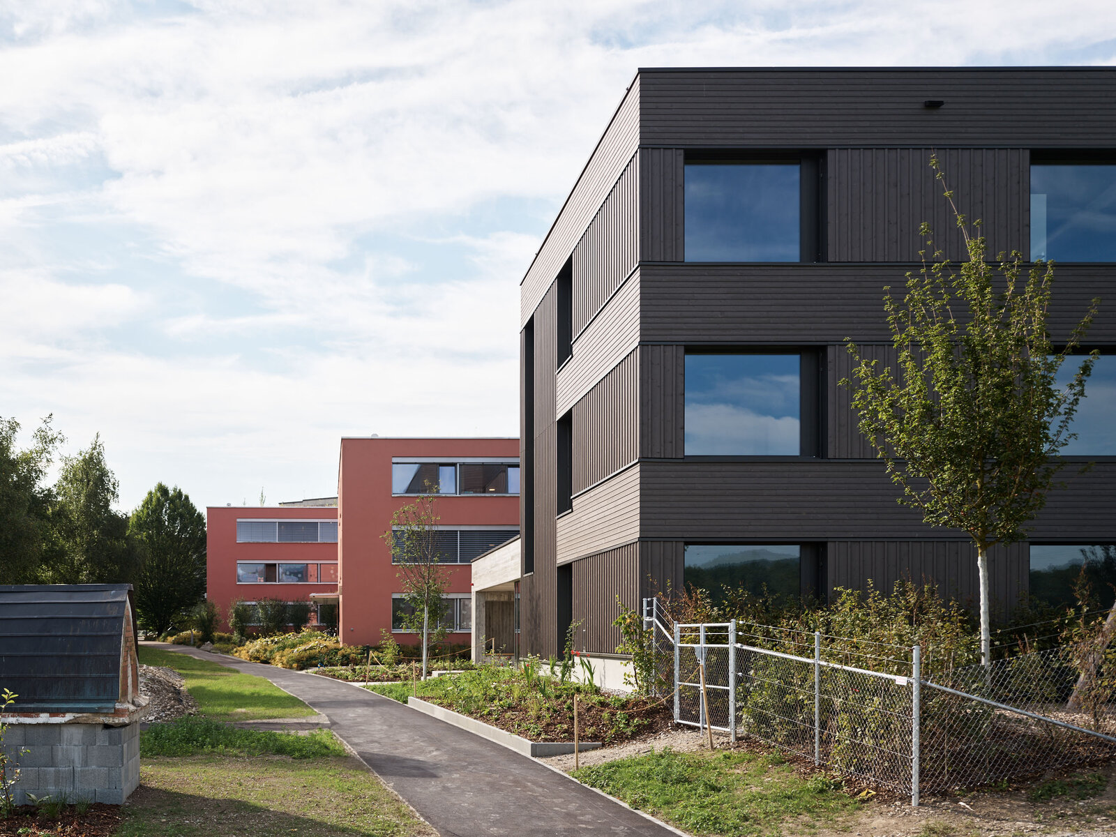 Der Neubau im Standard Minergie-P, fügt sich harmonisch in das Areal ein und bildet den Übergang zur Landwirtschaftszone. Ausgestattet mit kontrollierter Wohnraumlüftung, einer PV-Anlage und Fernwärmeheizung, setzt er auf Nachhaltigkeit. Reizarme und robuste Materialien, eine dezente Farbgestaltung sowie der Einsatz von Holz schaffen eine beruhigende Atmosphäre. Jede Wohngruppe bietet ein eigenes Bad sowie Gemeinschaftsräume zum Kochen, Essen und Wohnen, ergänzt durch Ateliers, einen Fitness- und Therapiebereich und Büros für das Betreuungspersonal. Ein naturnah gestalteter Garten mit unterschiedlich angelegten Zonen für vielfältige Nutzung- und Aufenthaltsmöglichkeiten, rundet das Angebot ab.