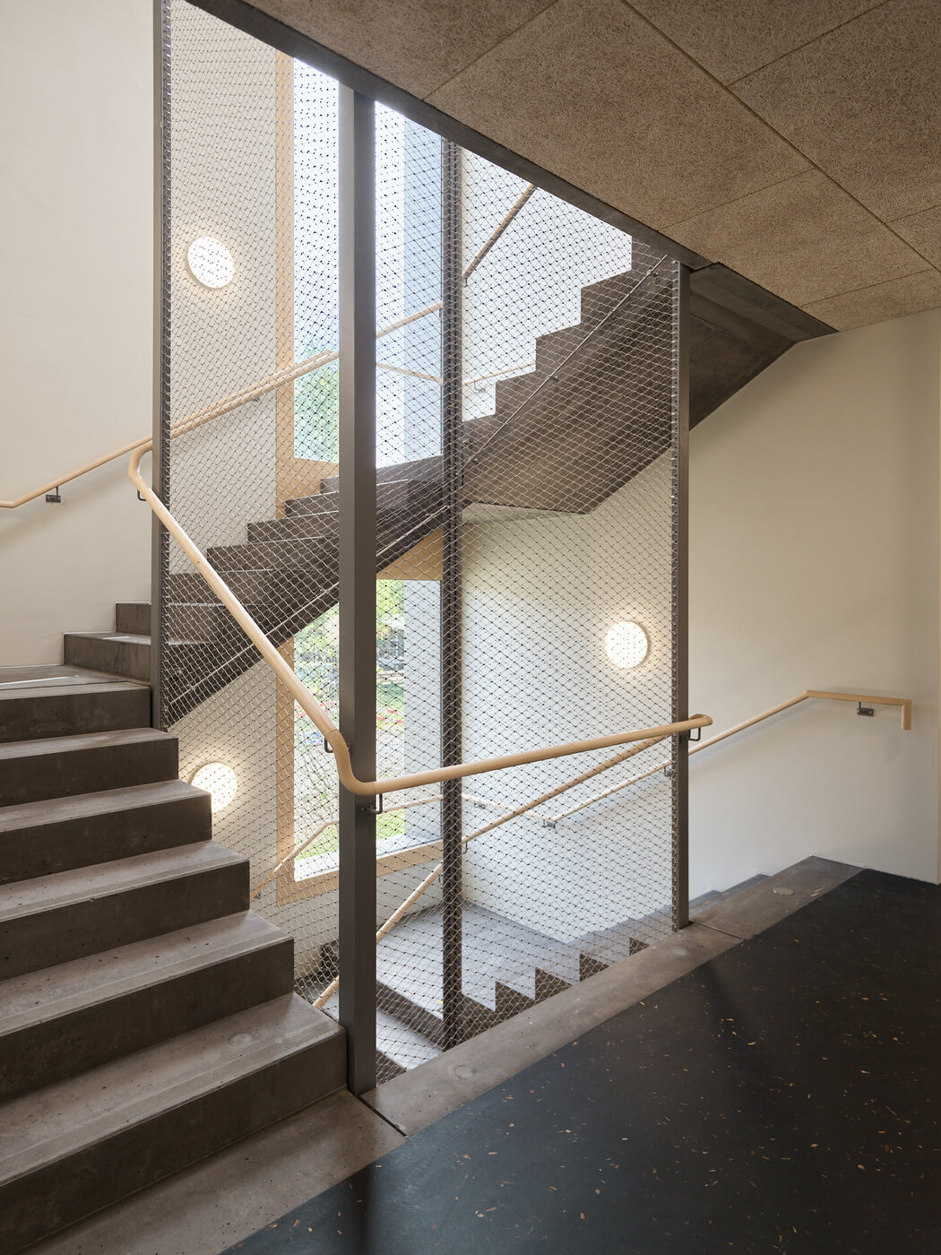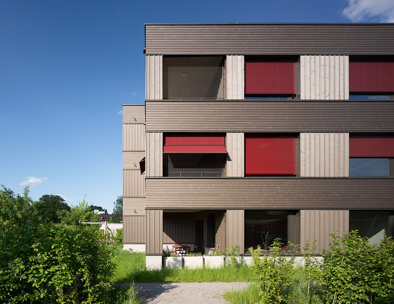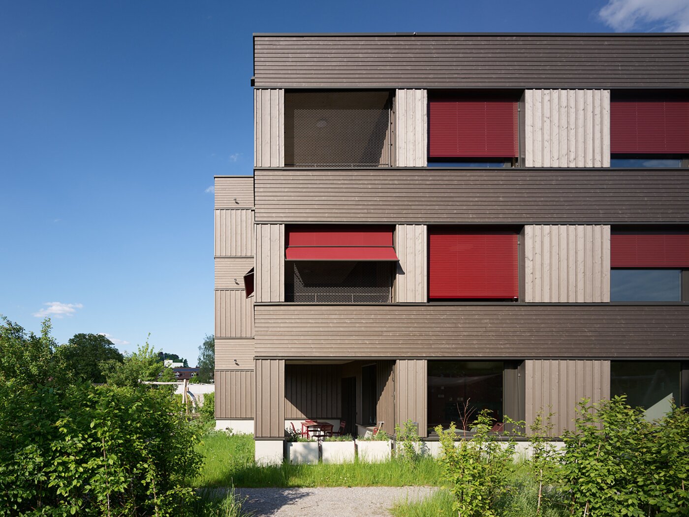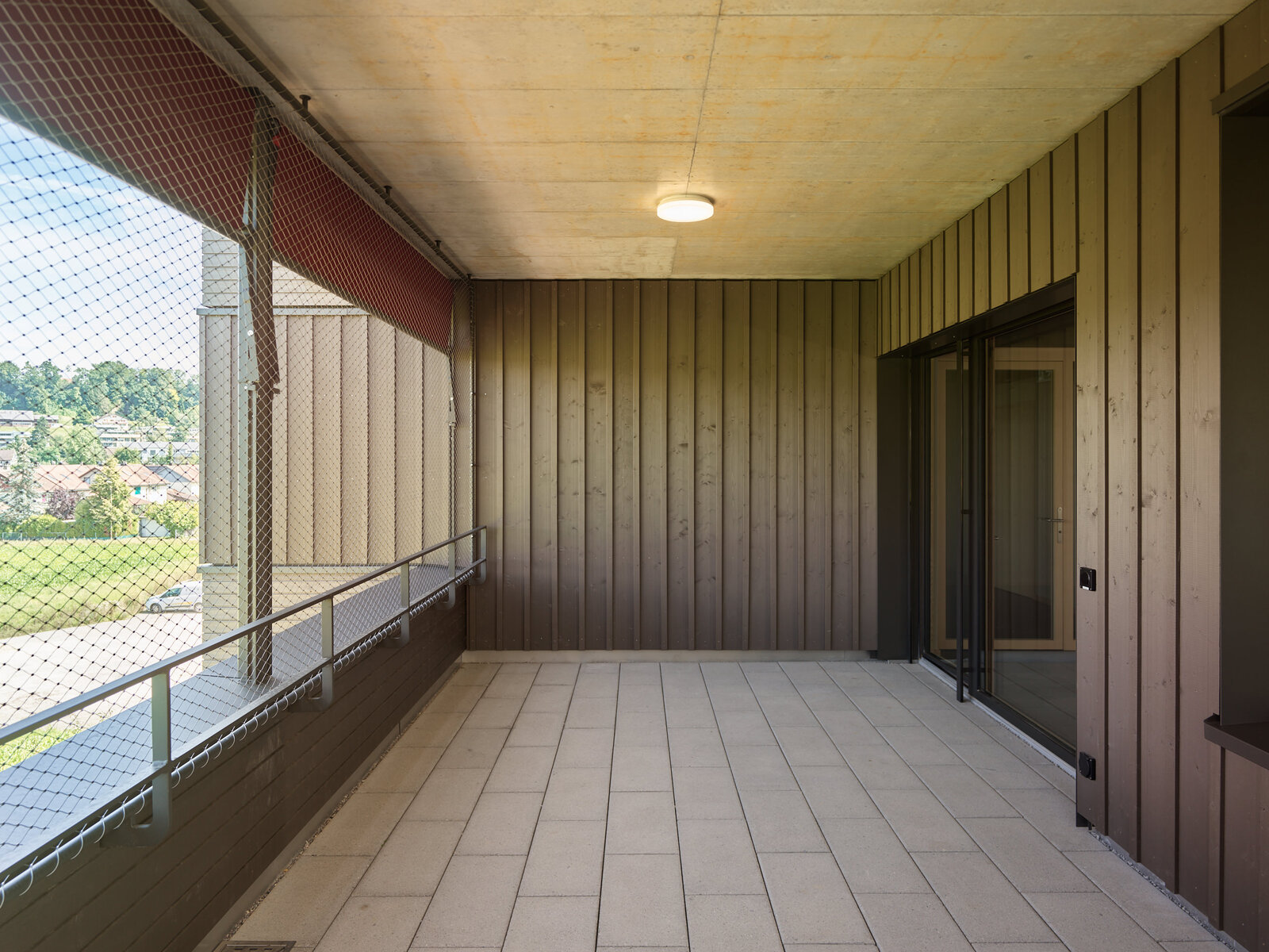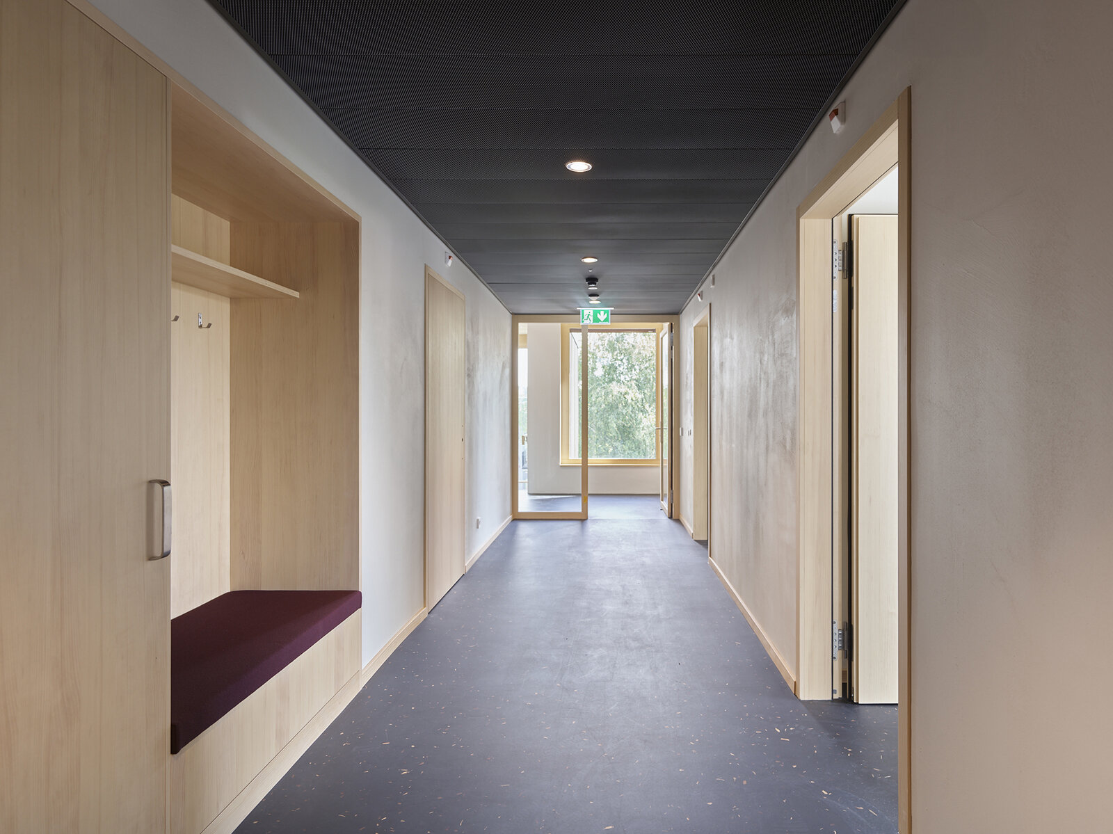 Der Neubau im Standard Minergie-P, fügt sich harmonisch in das Areal ein und bildet den Übergang zur Landwirtschaftszone. Ausgestattet mit kontrollierter Wohnraumlüftung, einer PV-Anlage und Fernwärmeheizung, setzt er auf Nachhaltigkeit. Reizarme und robuste Materialien, eine dezente Farbgestaltung sowie der Einsatz von Holz schaffen eine beruhigende Atmosphäre. Jede Wohngruppe bietet ein eigenes Bad sowie Gemeinschaftsräume zum Kochen, Essen und Wohnen, ergänzt durch Ateliers, einen Fitness- und Therapiebereich und Büros für das Betreuungspersonal. Ein naturnah gestalteter Garten mit unterschiedlich angelegten Zonen für vielfältige Nutzung- und Aufenthaltsmöglichkeiten, rundet das Angebot ab.