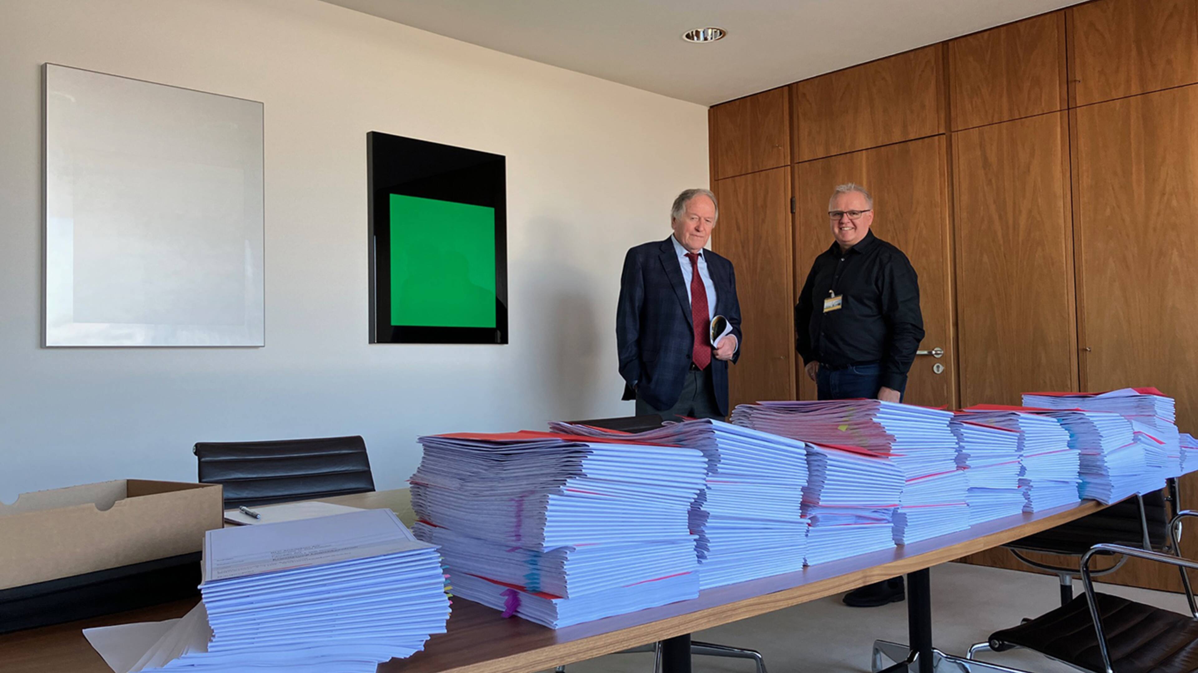 Letzte Woche durften wir zur Weishaupt Gruppe nach Schwendi (Baden-Württemberg) reisen, wo sich der Firmeninhaber Siegrid Weishaupt persönlich Zeit nahm, das umfangreiche Baugesuch für die Erweiterung des Logistikszentrums Pyropac AG in Sennwald zu unterzeichnen. Mit den Bauarbeiten soll im 3. Quartal dieses Jahres gestartet werden.