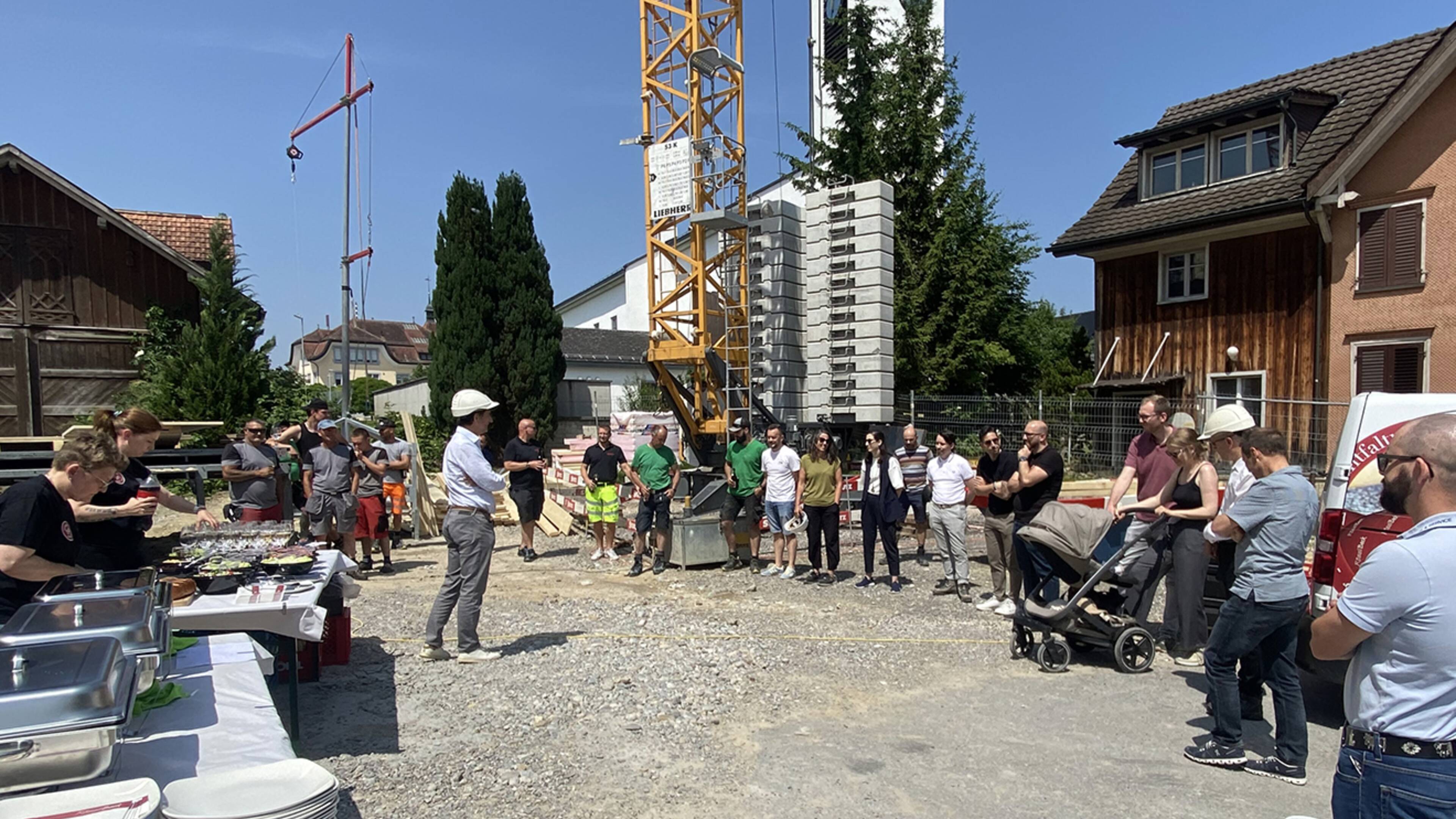 Beat Vetterli von der RLC Immoprojekt AG bedankt sich bei den anwesenden PlanerInnen und HandwerkerInnen für ihre wertvolle Arbeit.