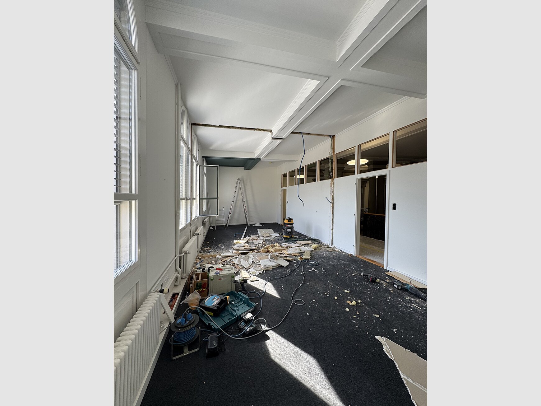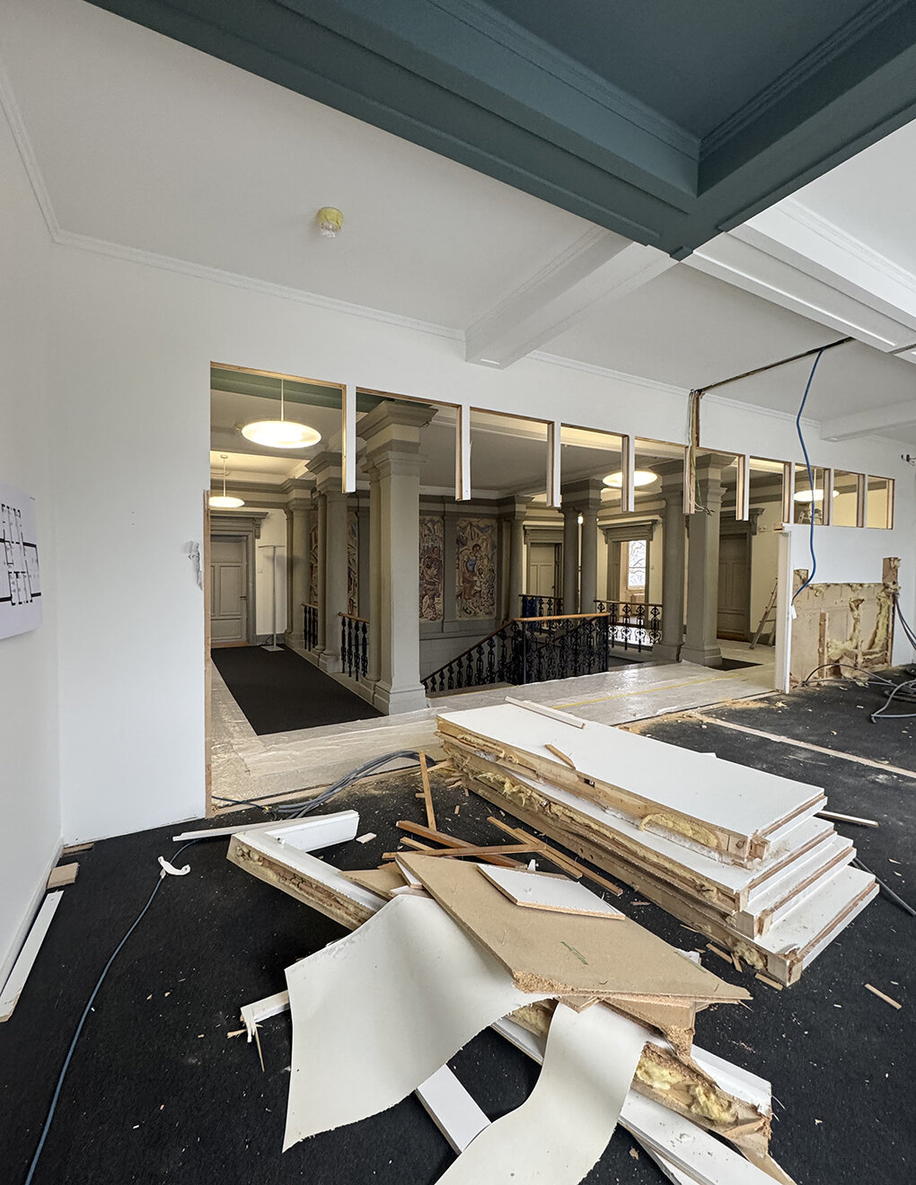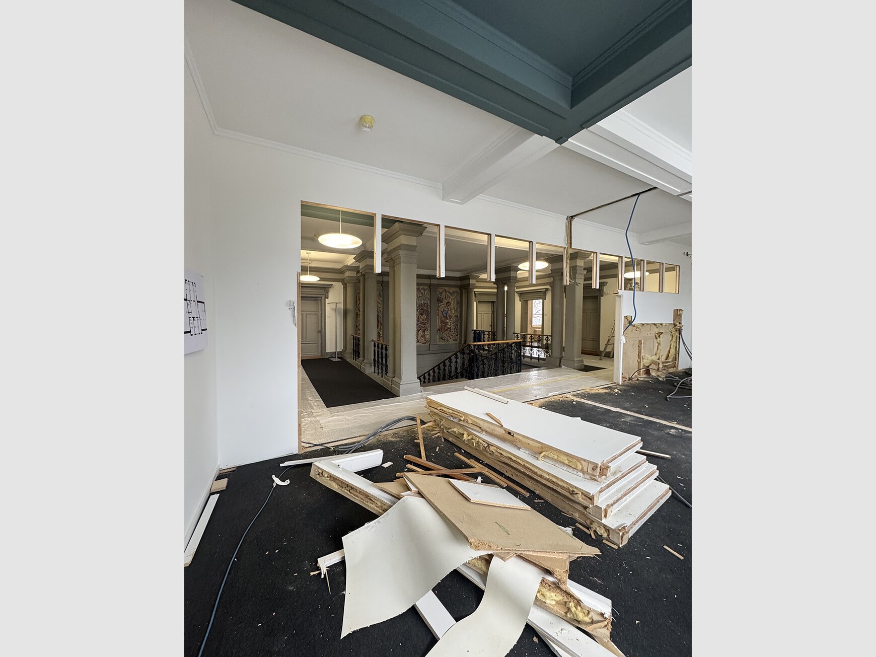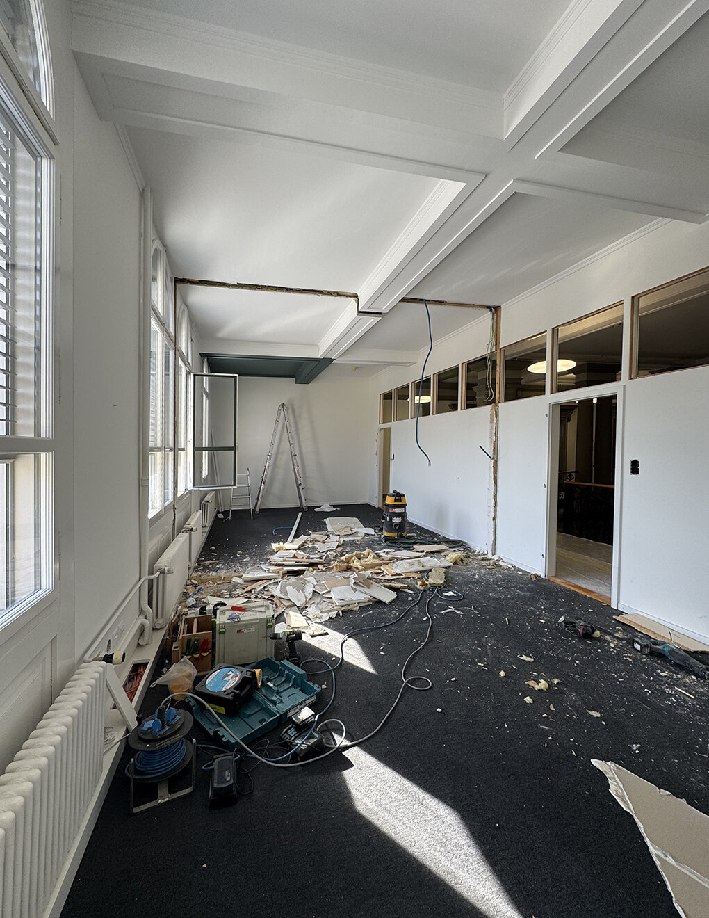 Anfang März haben die umfangreichen Bauarbeiten begonnen. Im ersten Obergeschoss werden die nachträglich eingebauten Trennwände entfernt, um eine grosse, multifunktional nutzbare Halle zu schaffen. Gleichzeitig wird der bisher zu schmale Pausenraum in eine moderne Teamküche umgebaut. Ein Teil der künftigen Möblierung wird im Sinne des Reuse-Gedankens aus nicht mehr verwendeten Büromöbeln erstellt und wiederverwendet. Durch die Neuordnung entsteht ein modernes Arbeitsumfeld, das frischen Schwung in den Büroalltag bringt. Wir freuen uns auf die Fertigstellung im Mai.