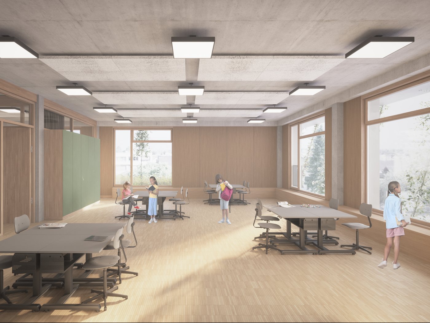 Das neue Schulhaus wird Platz für zehn Klassenzimmer bieten, ergänzt durch Gruppen- und Lehrerzimmer, eine offene Lernlandschaft sowie einen Mehrzweckraum. Im Untergeschoss entstehen eine Tiefgarage mit 23 Stellplätzen und ein grosszügiger Veloraum. Nachhaltige Bauweise mit Photovoltaikanlage, moderne Lernumgebungen und attraktive Aussenflächen mit Spielzonen machen den Neubau zu einem echten Mehrwert für Kinder, Lehrpersonen und die Bevölkerung.