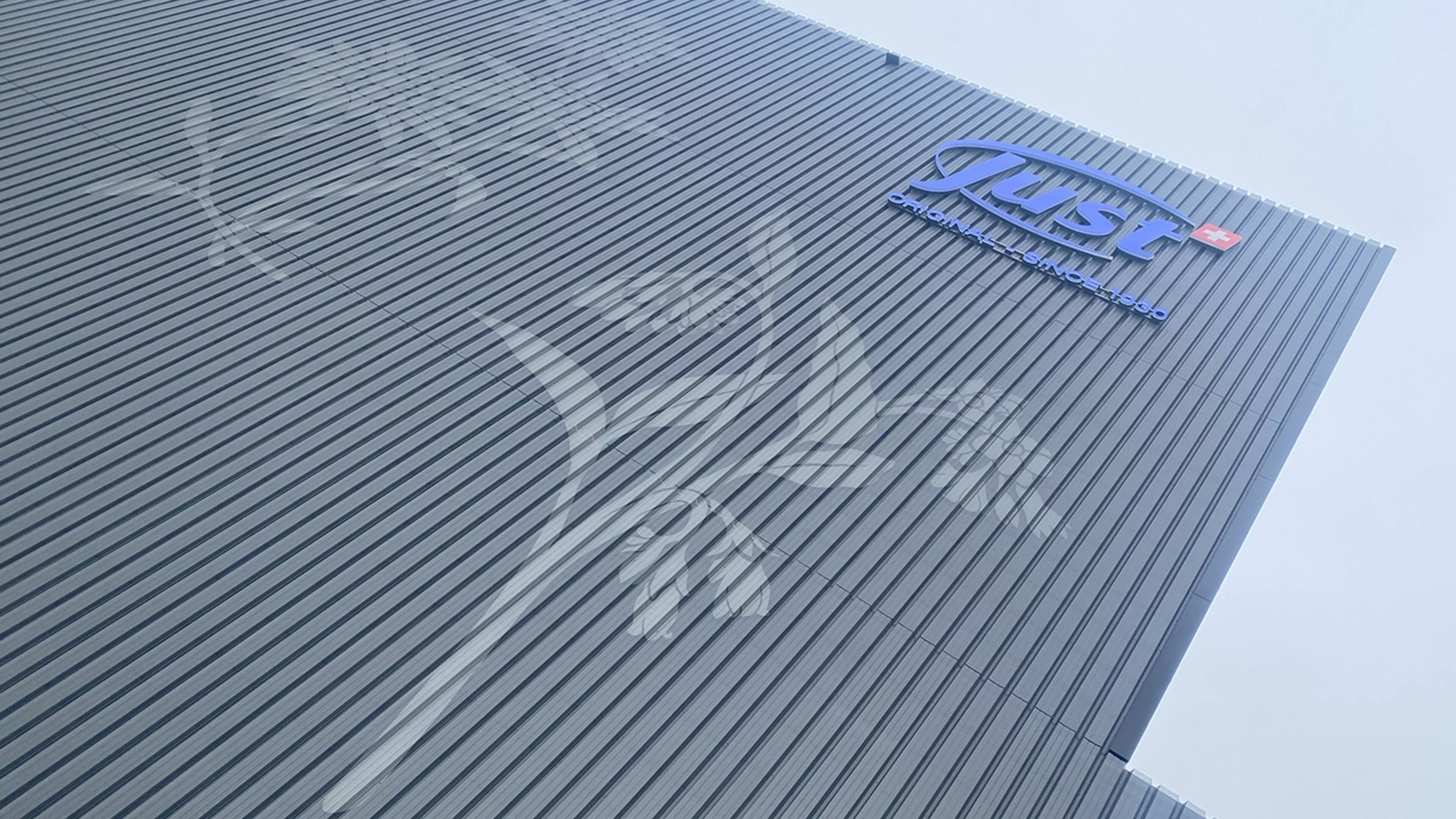 Die Fassade des Hochregallagers wird mit einer hinterlüfteten Fassade, bestehend aus einer gefalteten und perforierten Blechverkleidung mit eingearbeiteten Pflanzenmotiven realisiert. Die leicht durchschimmernden Pflanzen schaffen den Bezug zu den hochwertigen und nachhaltigen Produkten der Firma JUST.