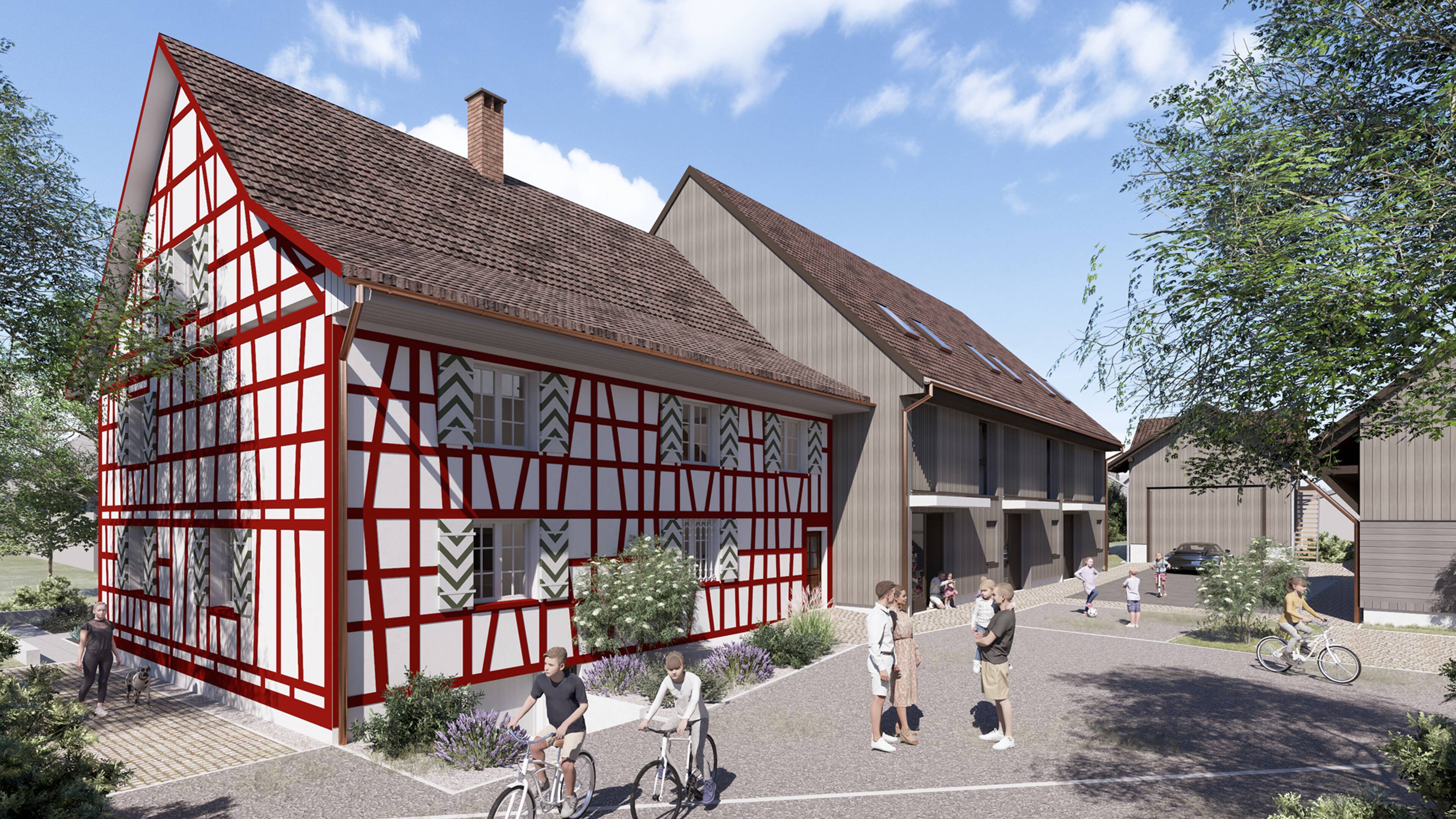Die an das Haupthaus (A) angrenzende Stallscheue (B-D) weist keine denkmalpflegerische Qualität auf. Sie wird durch einen Neubau mit 3 Reihen-Einfamilienhäusern im Standard Minergie-P ersetzt. Der ehemalige Pferdestall (F-H) weicht ebenfalls einem schmaleren Ersatzneubau ersetzt. Beide Neubauten richten sich in ihrer Dachform und Typologie nach dem heutigen Bestand. Die bestehende Remise (E) bleibt erhalten und wird als Garage mit Hobbyraum umgenutzt.