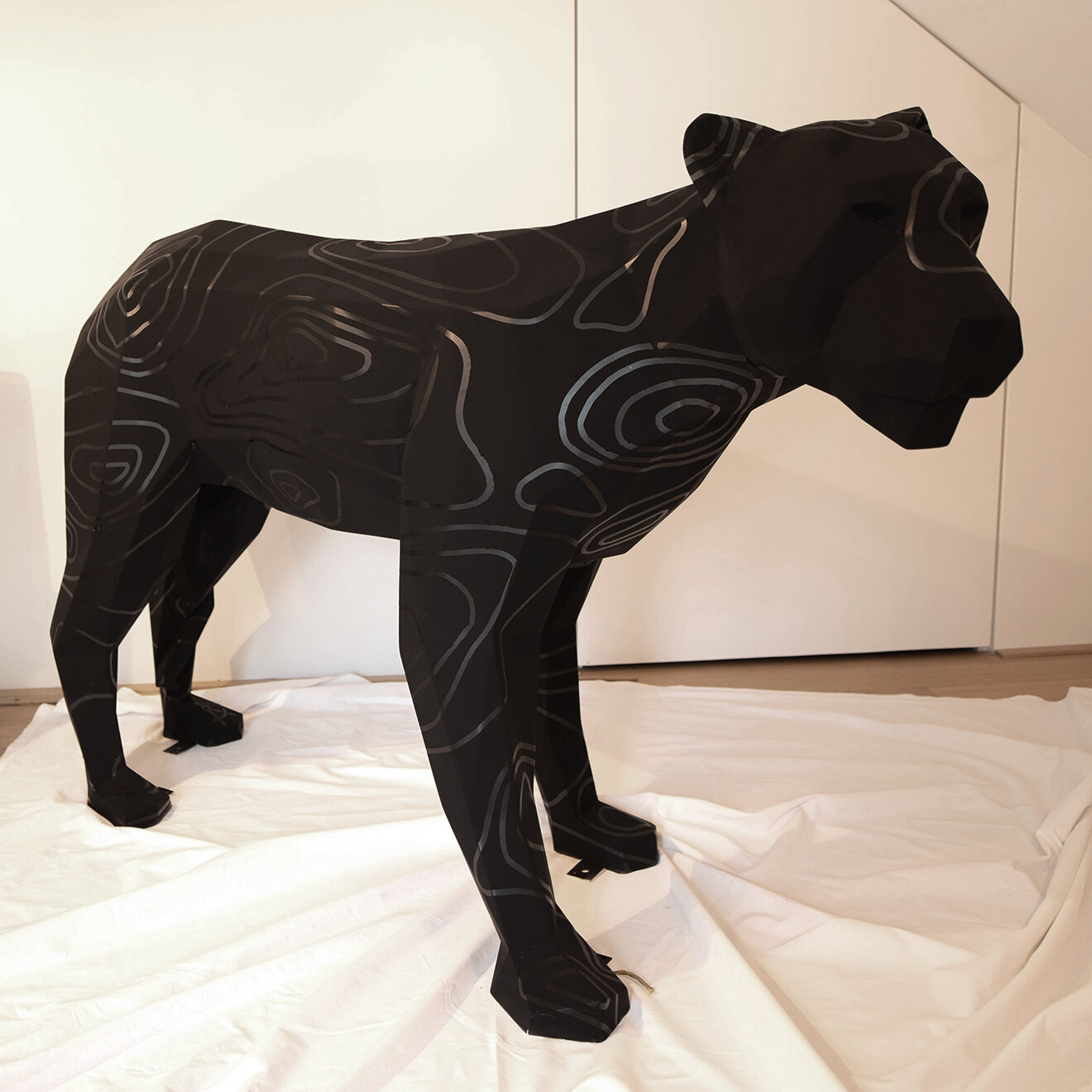 In Zusammenarbeit mit CHROMEO entstand das Konzept, wie unsere Tätigkeit als Architekten in künstlerischer Form auf unsere Löwin adaptiert werden kann. So schmiegen sich – wie die Höhenkurven eines Architekturmodells – feine Linien entlang des Körpers unserer Löwin.